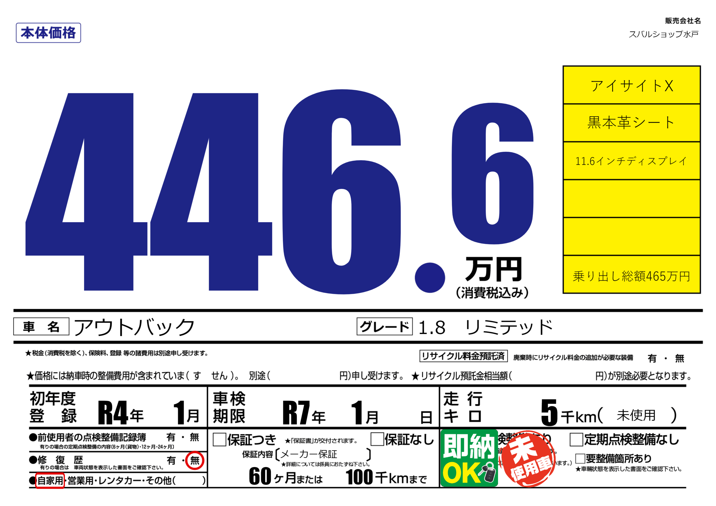 | 車名 | アウトバック | グレード ミッション 排気量 |