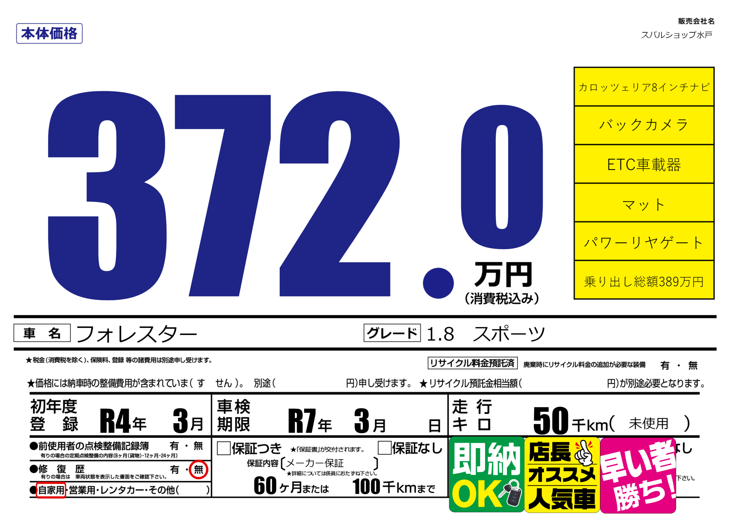 | 車名 | フォレスター | グレード ミッション 排気量 |