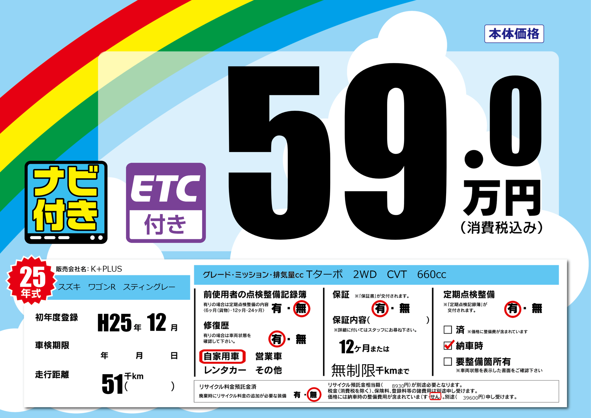 | 車名 | スズキ ワゴンR スティングレー | グレード ミッション 排気量 |