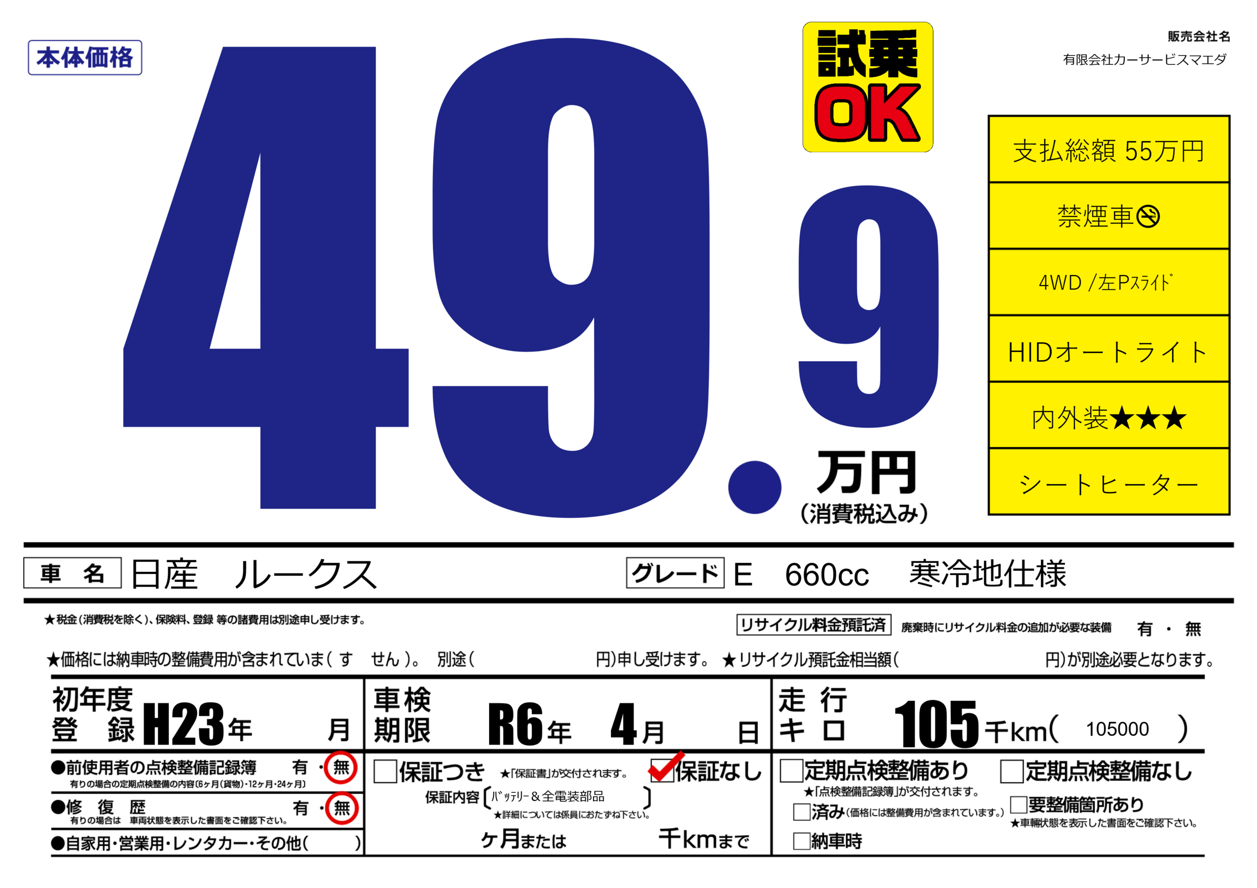 | 車名 | 日産 ルークス | グレード ミッション 排気量 |