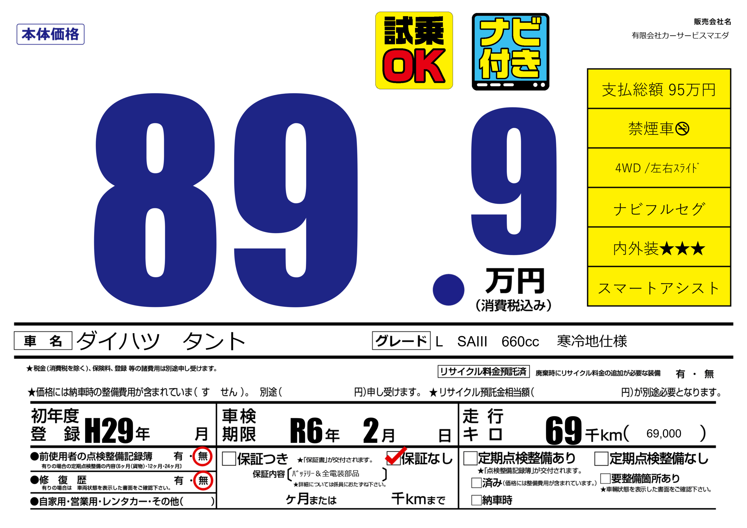 | 車名 | ダイハツ タント | グレード ミッション 排気量 |