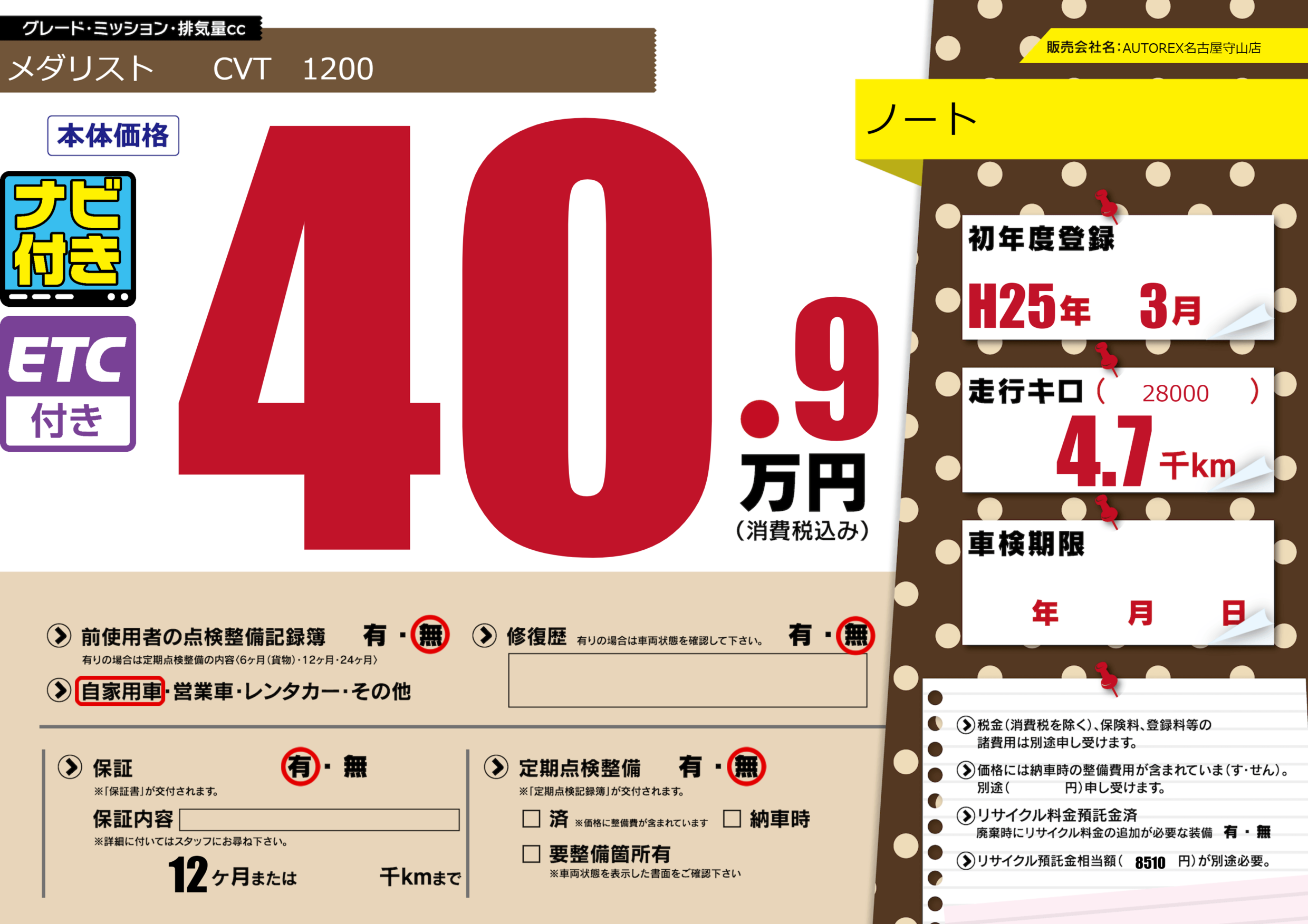 保証付き 保証内容(---) 12ヶ月または()千kmまで |