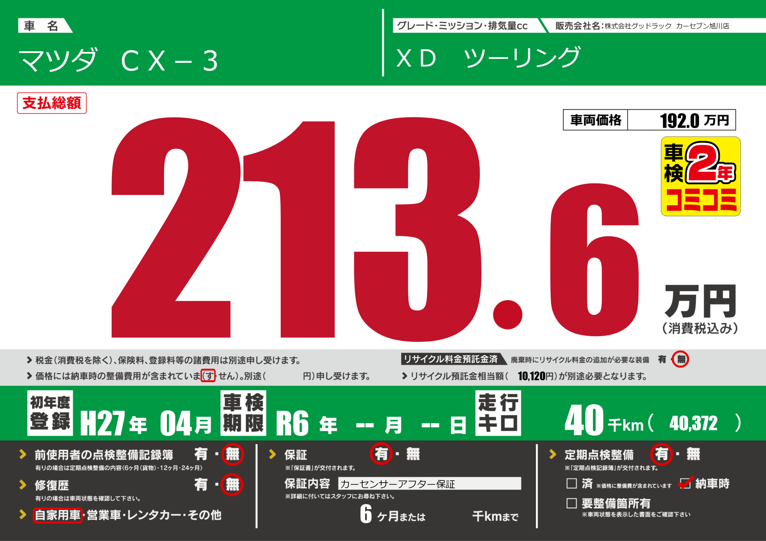 | 車検制限 | R6年 --月 --日 | ||
