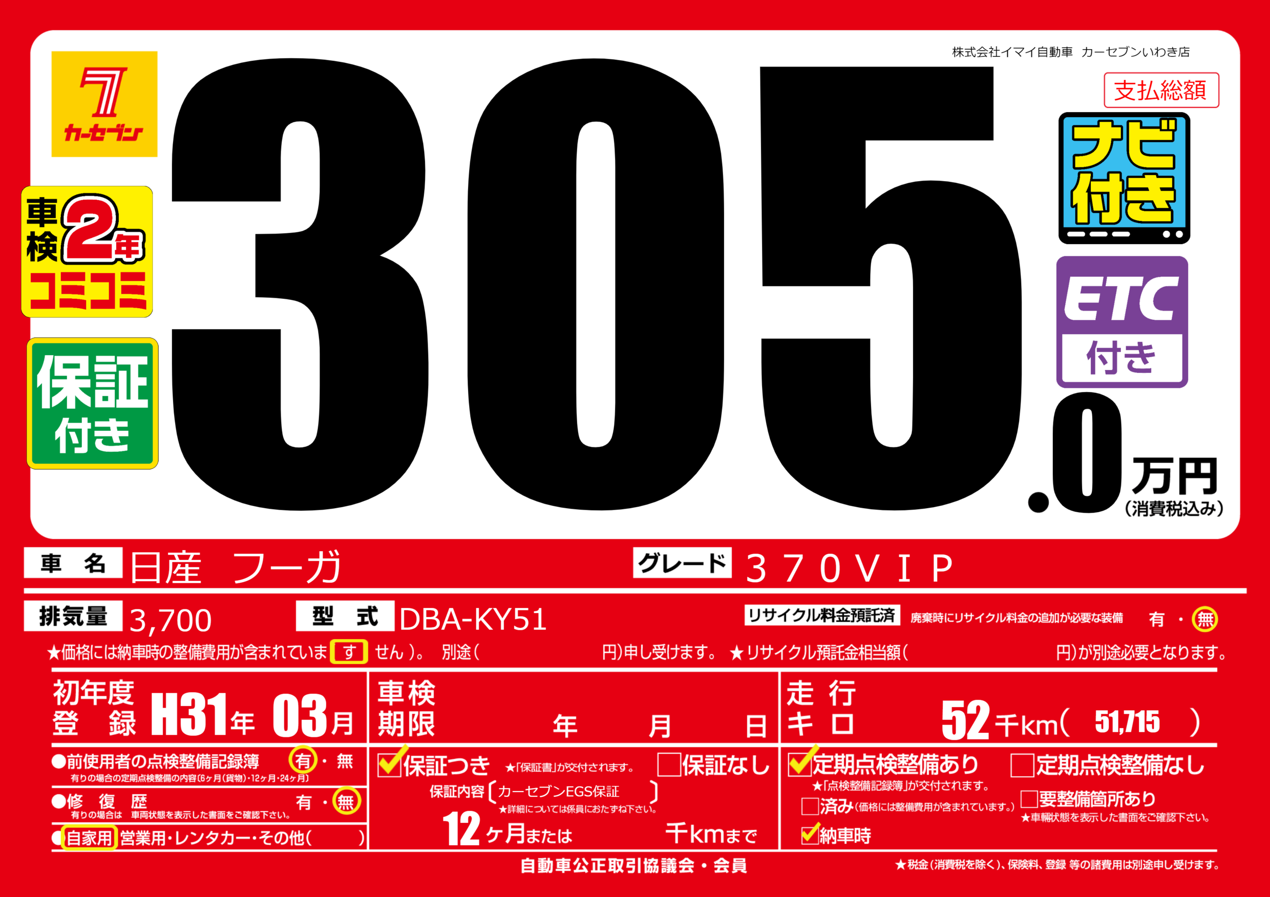 | 車名 | 日産 フーガ | グレード ミッション 排気量 |