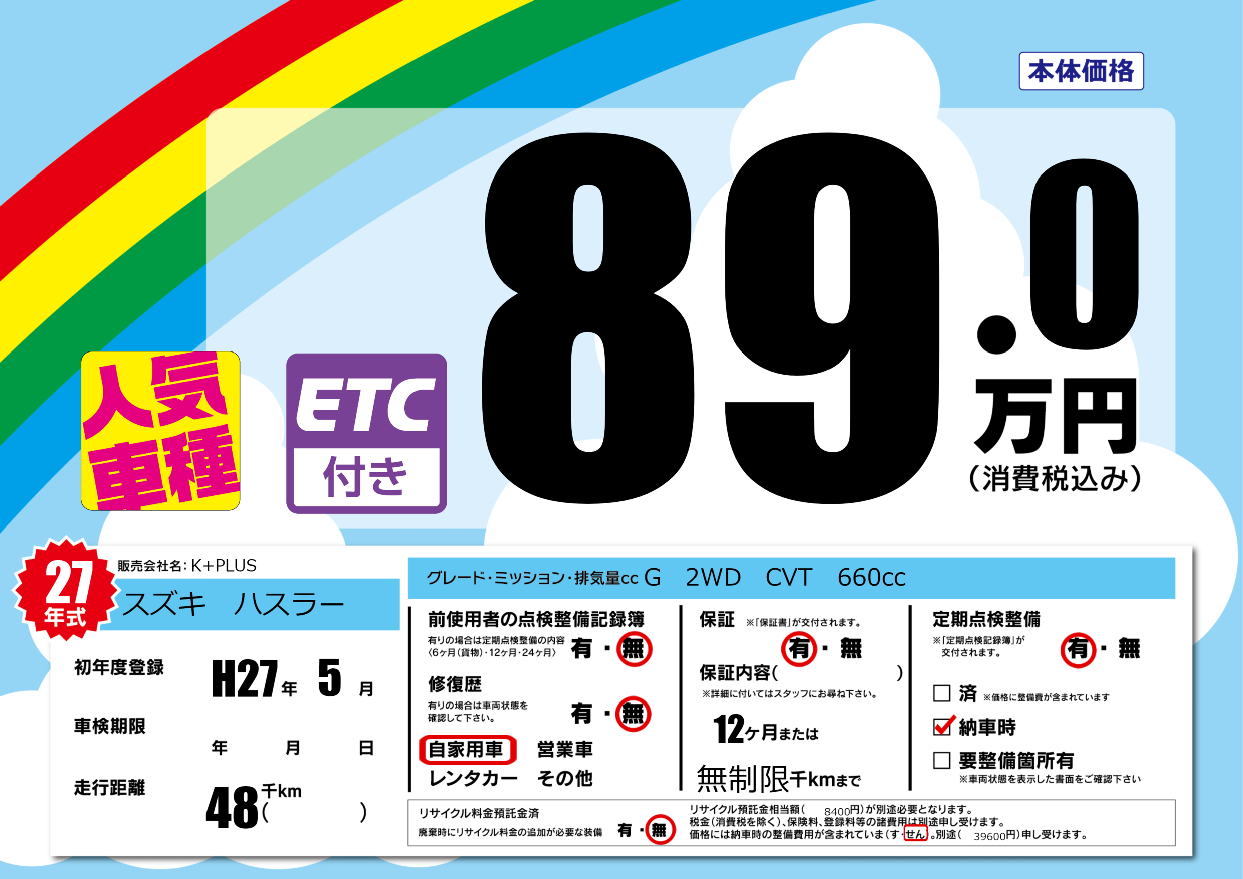 | 車名 | スズキ ハスラー | グレード ミッション 排気量 |