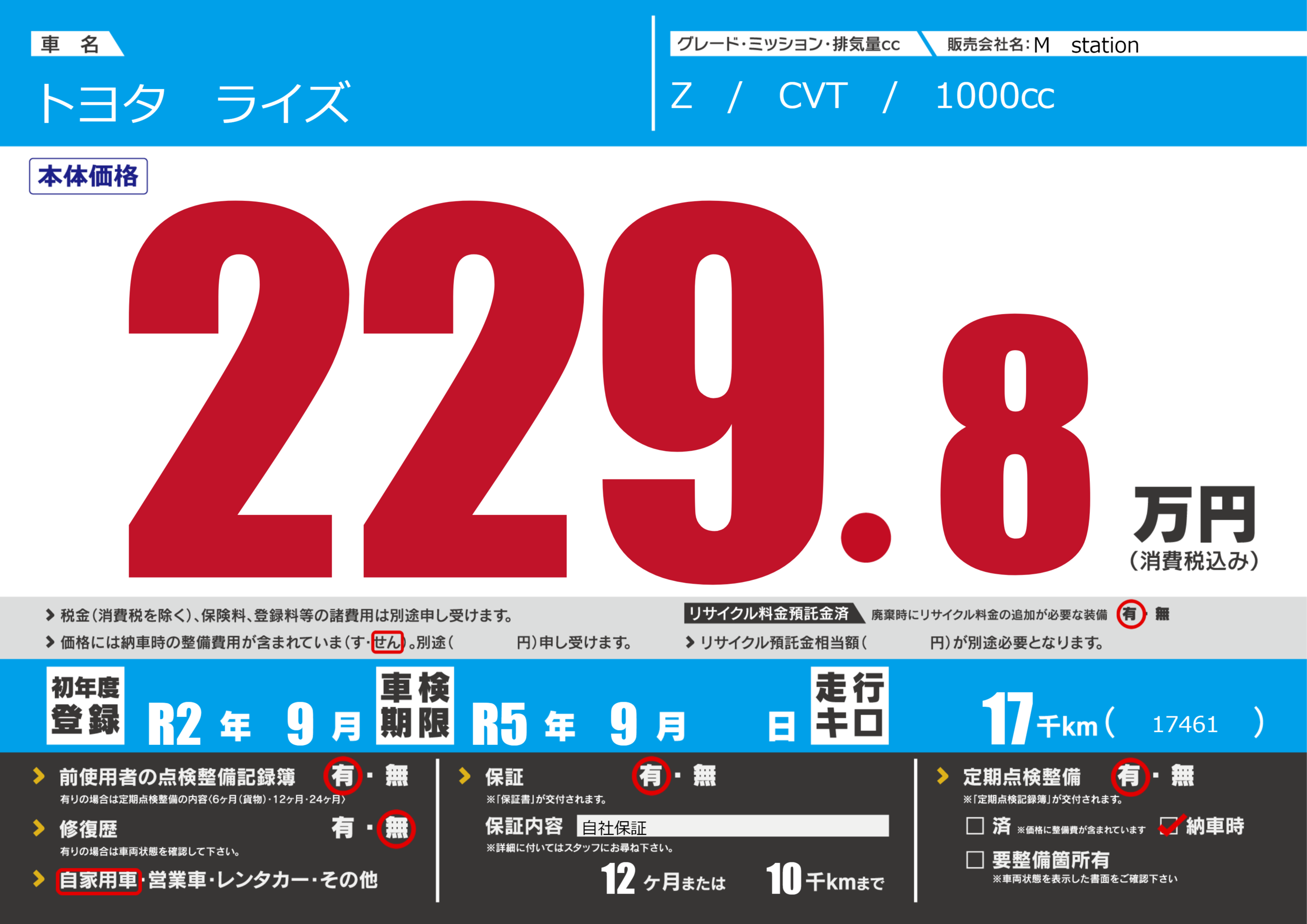 | 車名 | トヨタ ライズ | グレード ミッション 排気量 |