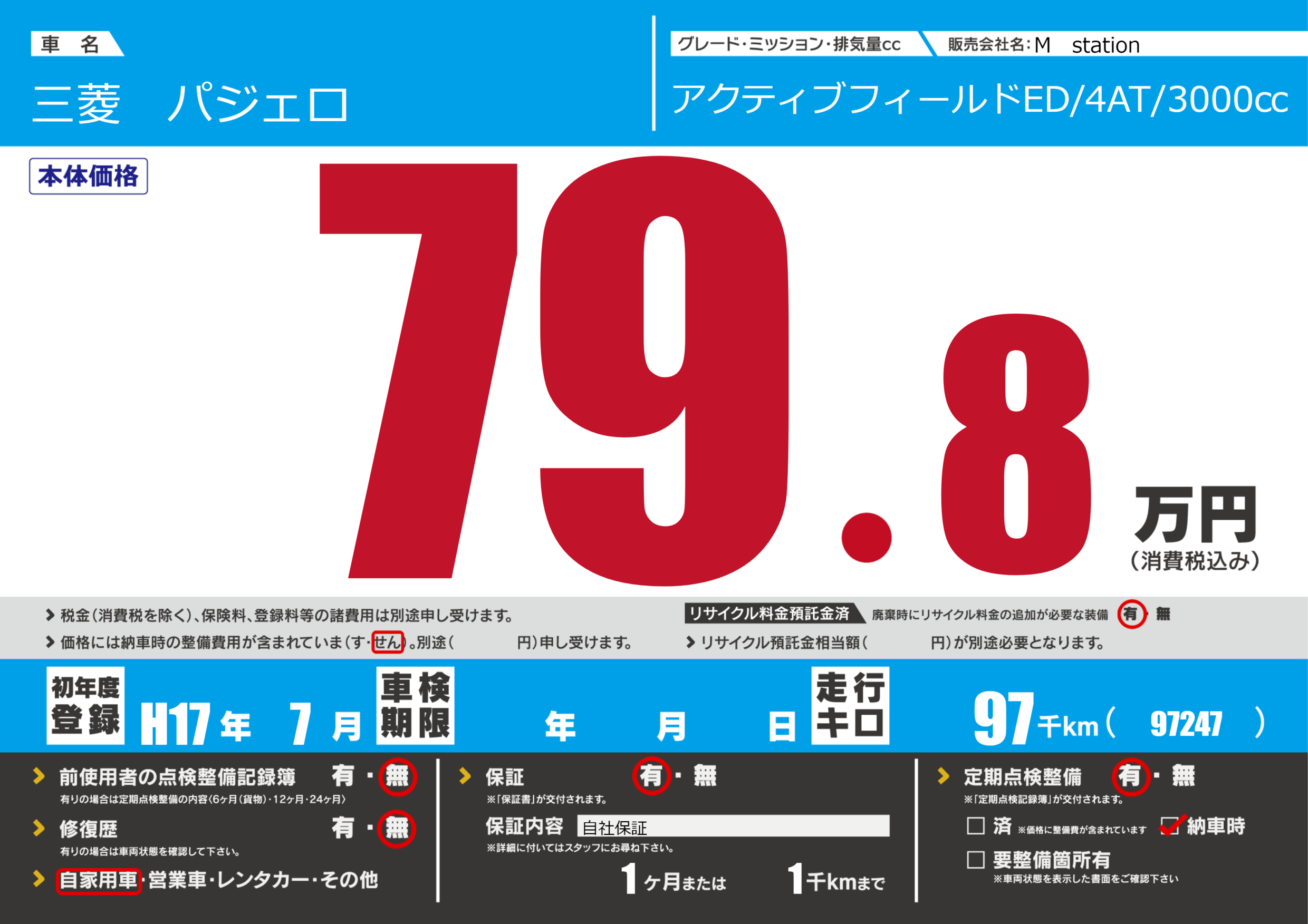 | 車名 | 三菱 パジェロ | グレード ミッション 排気量 |