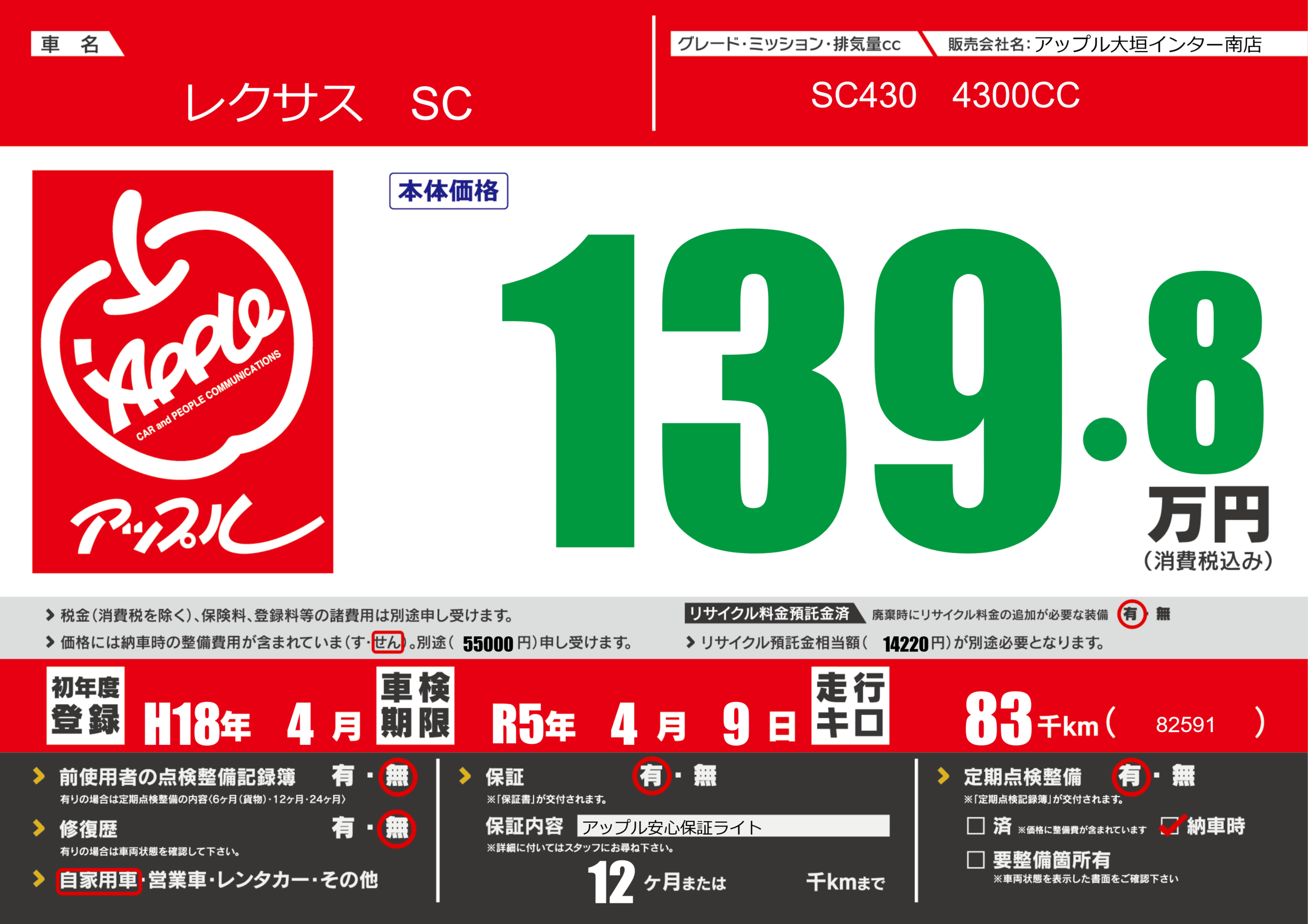 保証付き 保証内容(アップル安心保証ライト) 12ヶ月または()千kmまで |
