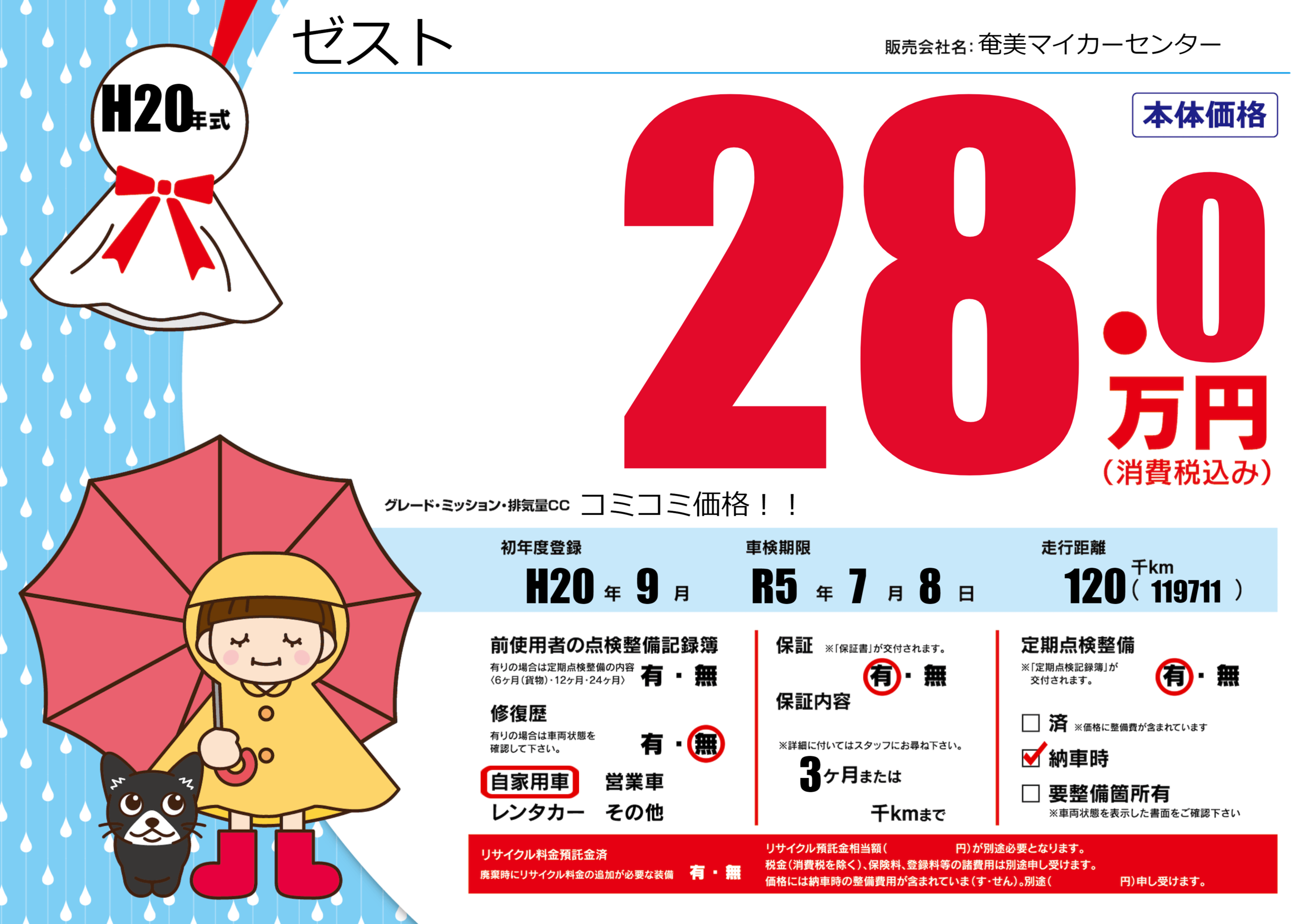 | 走行キロ | 12万km | 初年度登録 | H20年9月 |