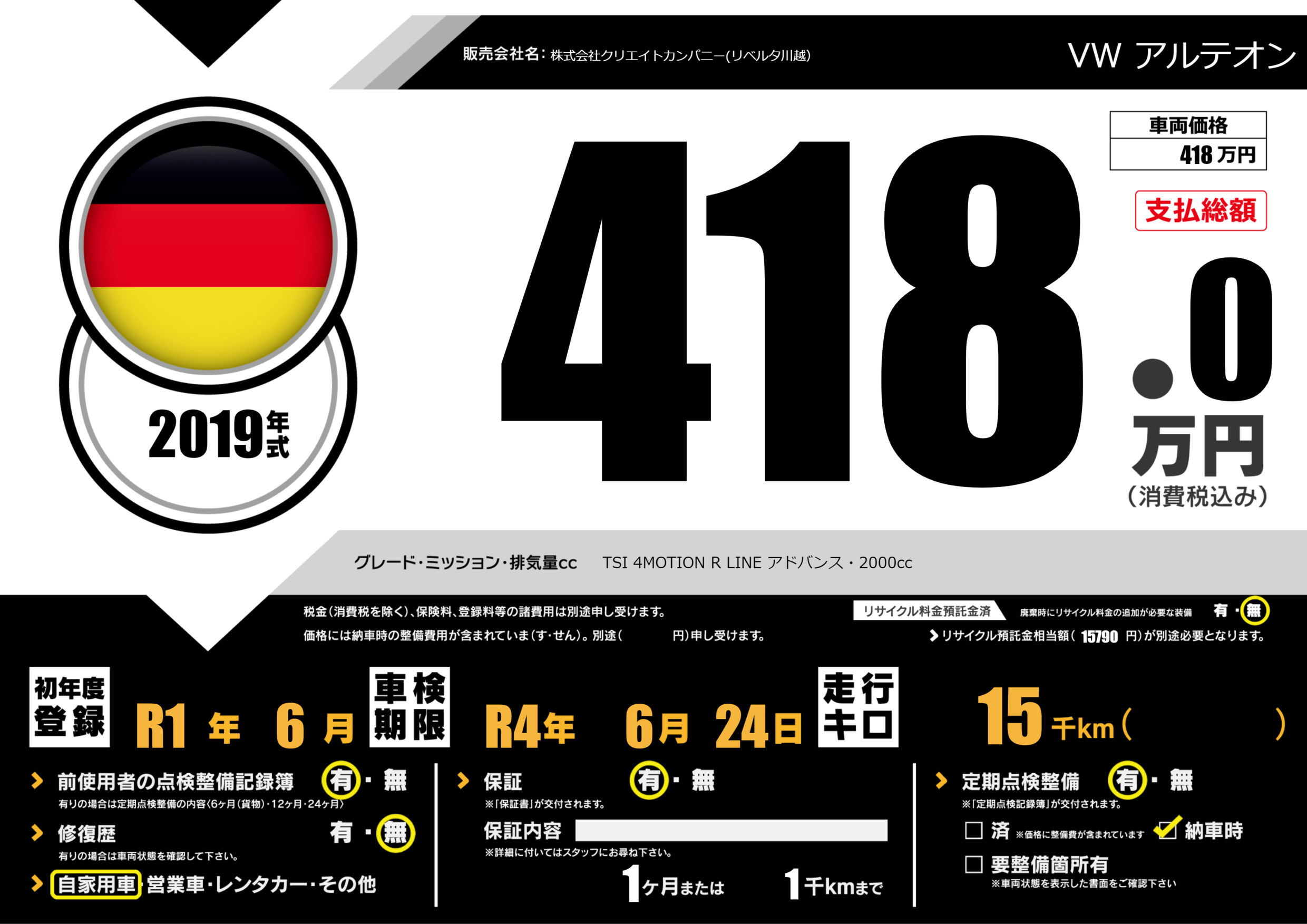 | 車名 | VW アルテオン | グレード ミッション 排気量 |