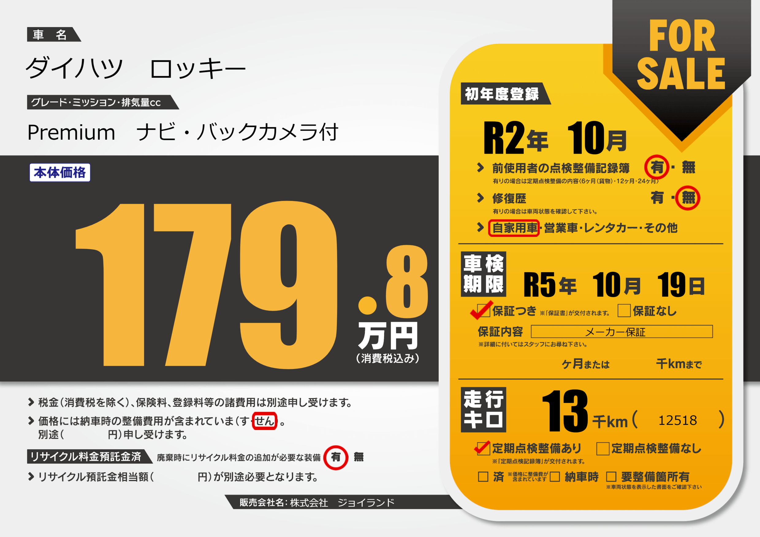 | 車名 | ダイハツ ロッキー | グレード ミッション 排気量 |