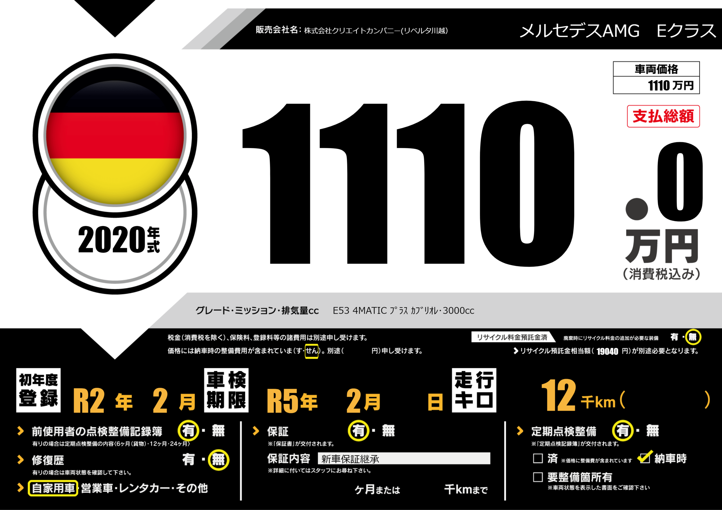 | 車名 | メルセデスAMG Eクラス | グレード ミッション 排気量 |