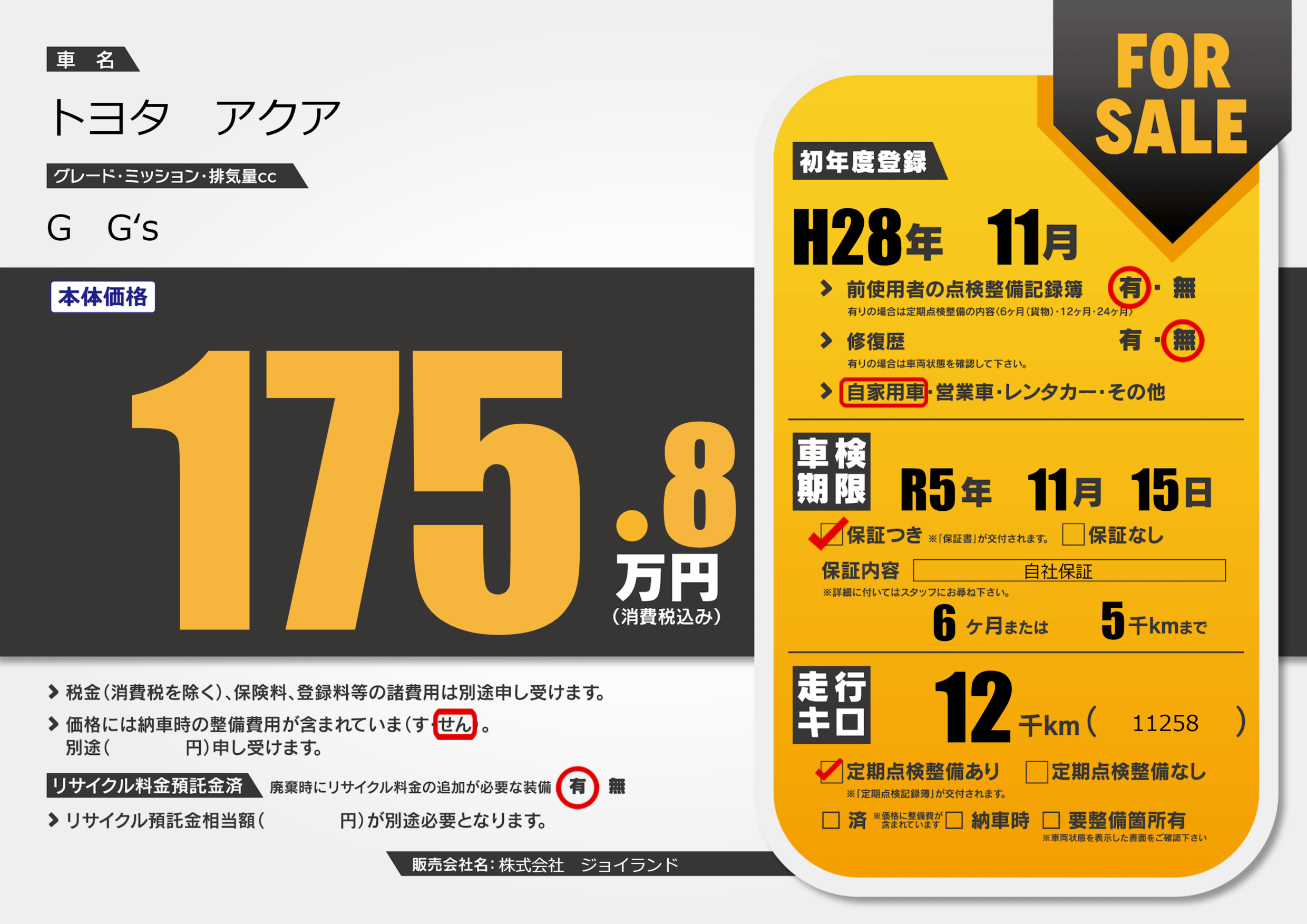 | 車名 | トヨタ アクア | グレード ミッション 排気量 |