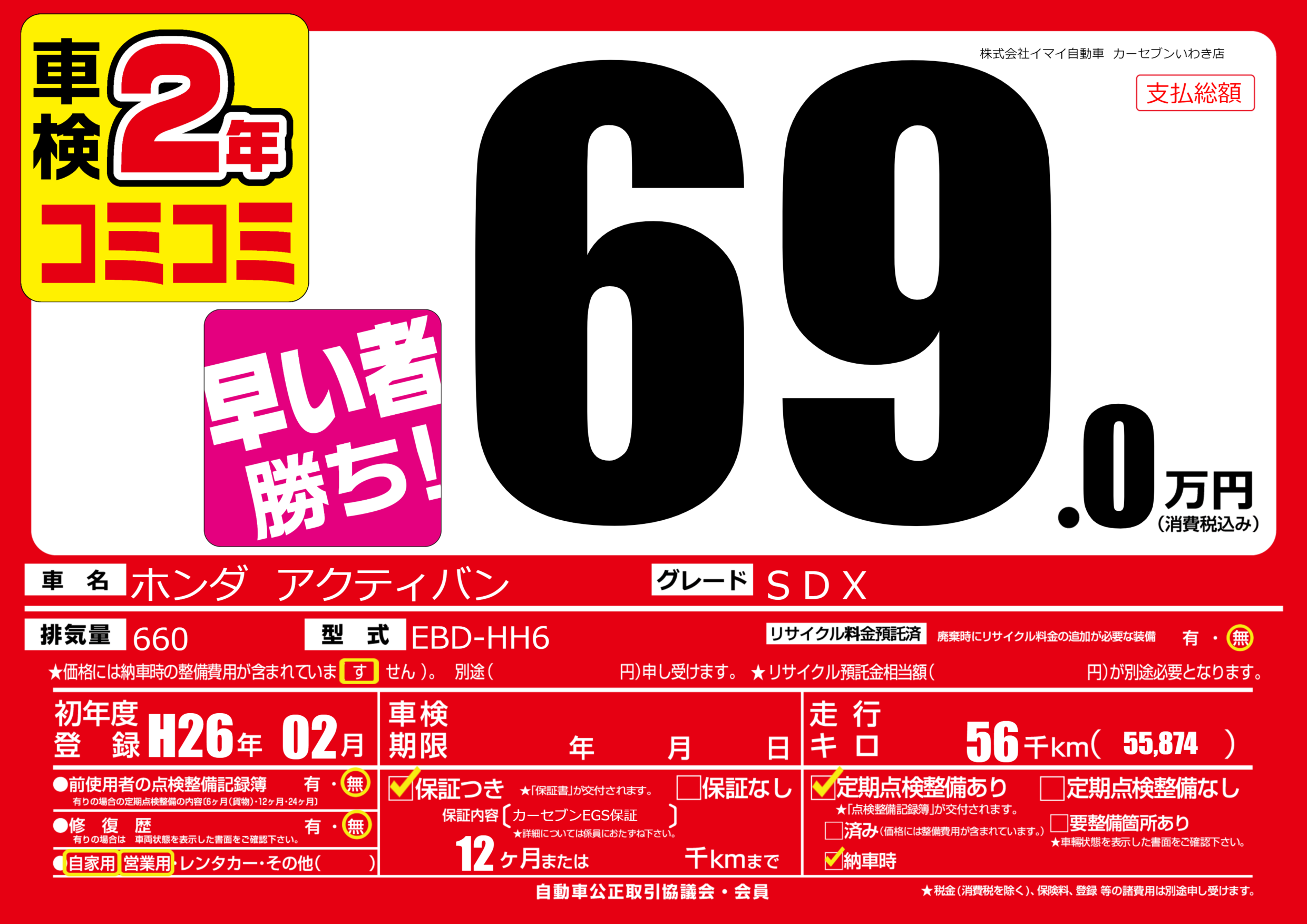 | 車名 | ホンダ アクティバン | グレード ミッション 排気量 |