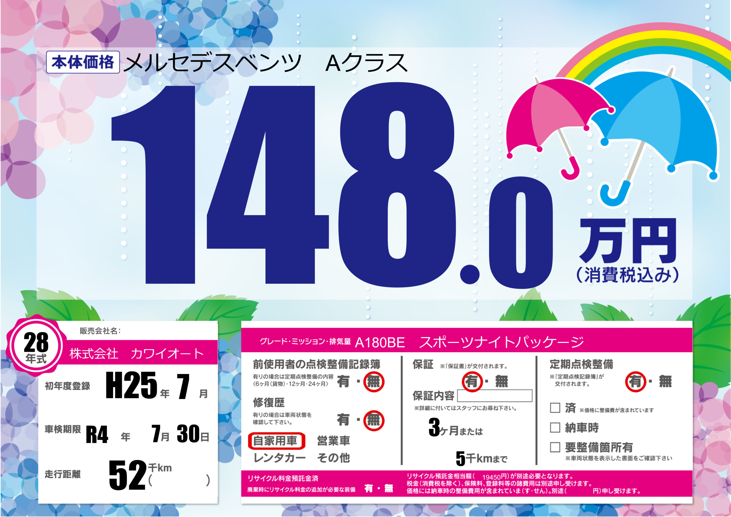 | 車名 | メルセデスベンツ Aクラス | グレード ミッション 排気量 |