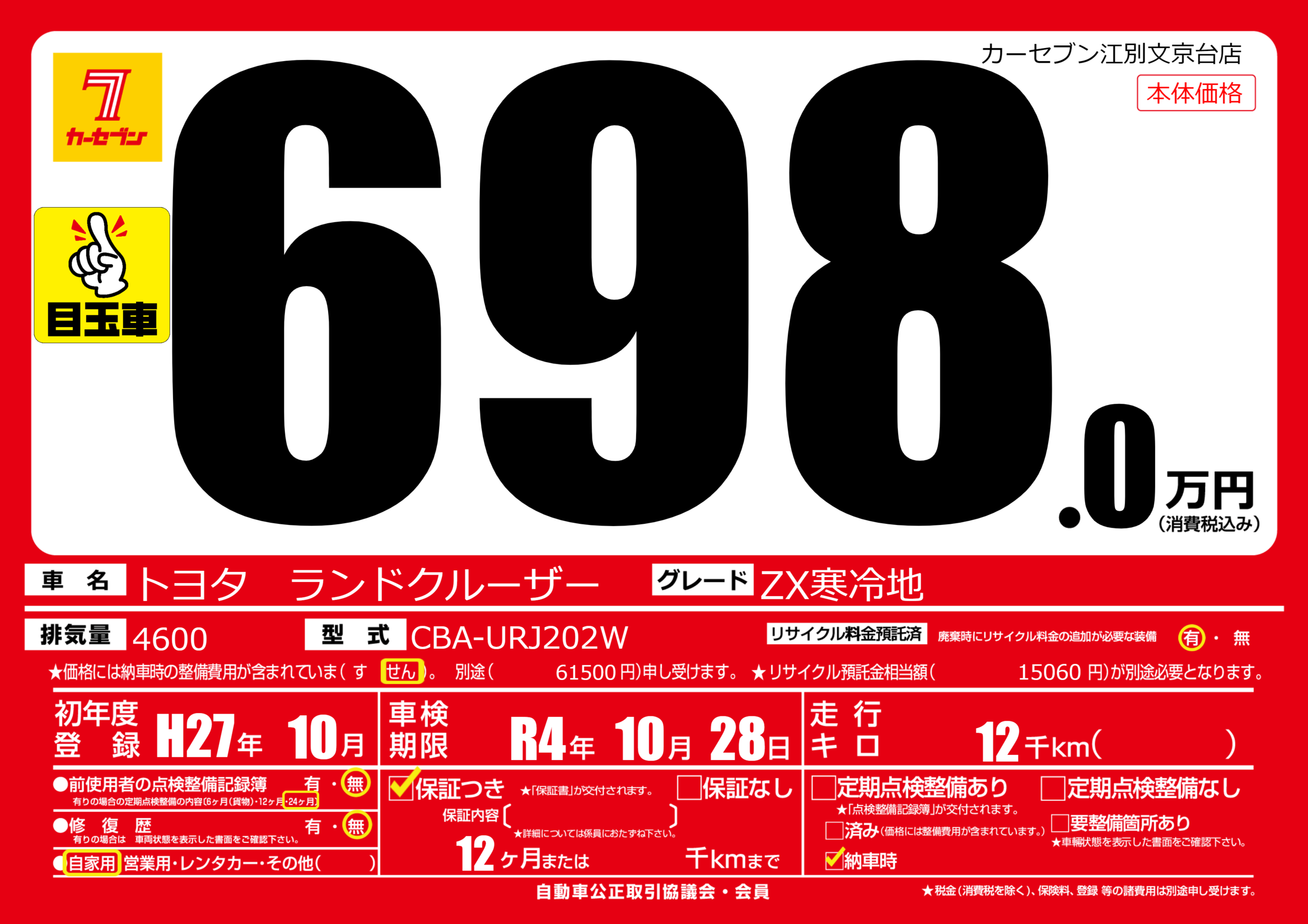 | 車名 | トヨタ ランドクルーザー | グレード ミッション 排気量 |