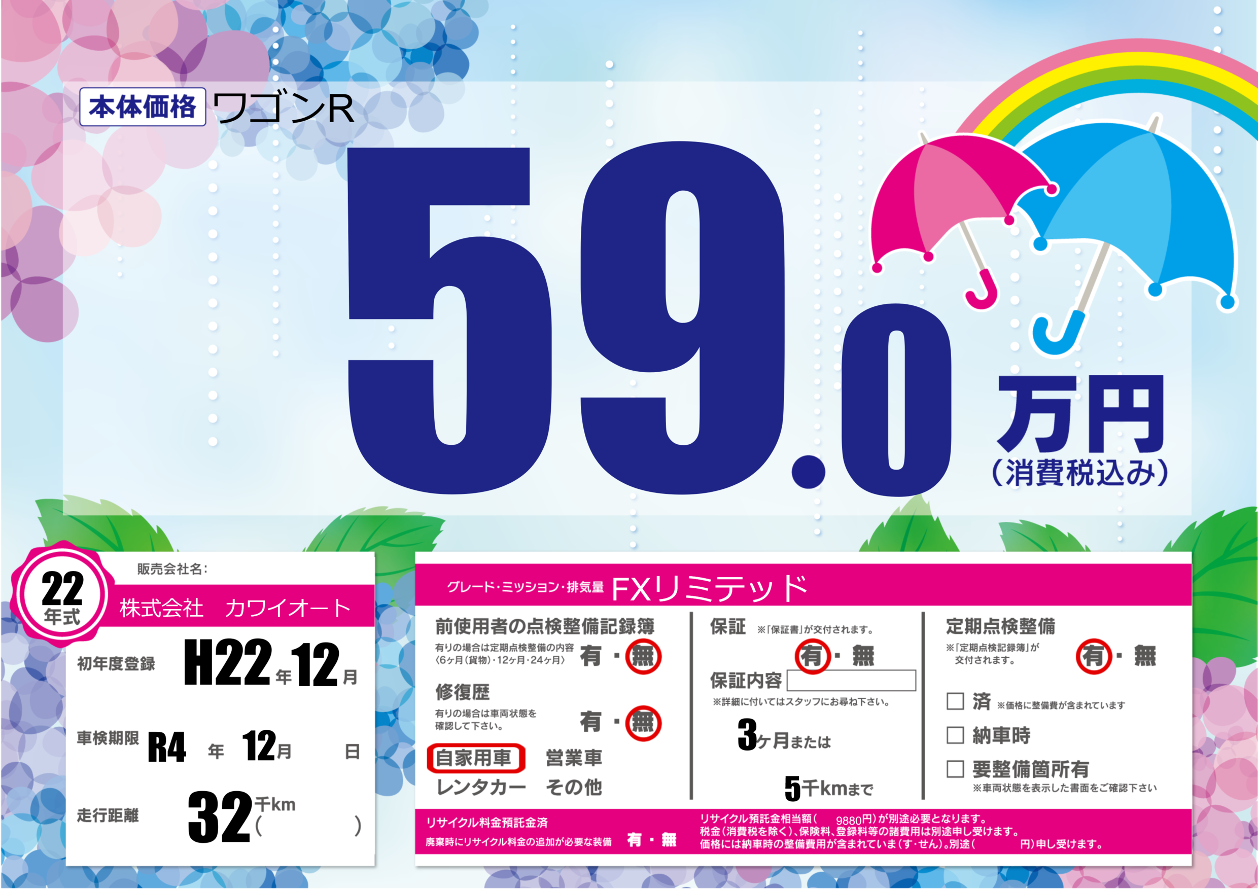 | 車名 | ワゴンR | グレード ミッション 排気量 |