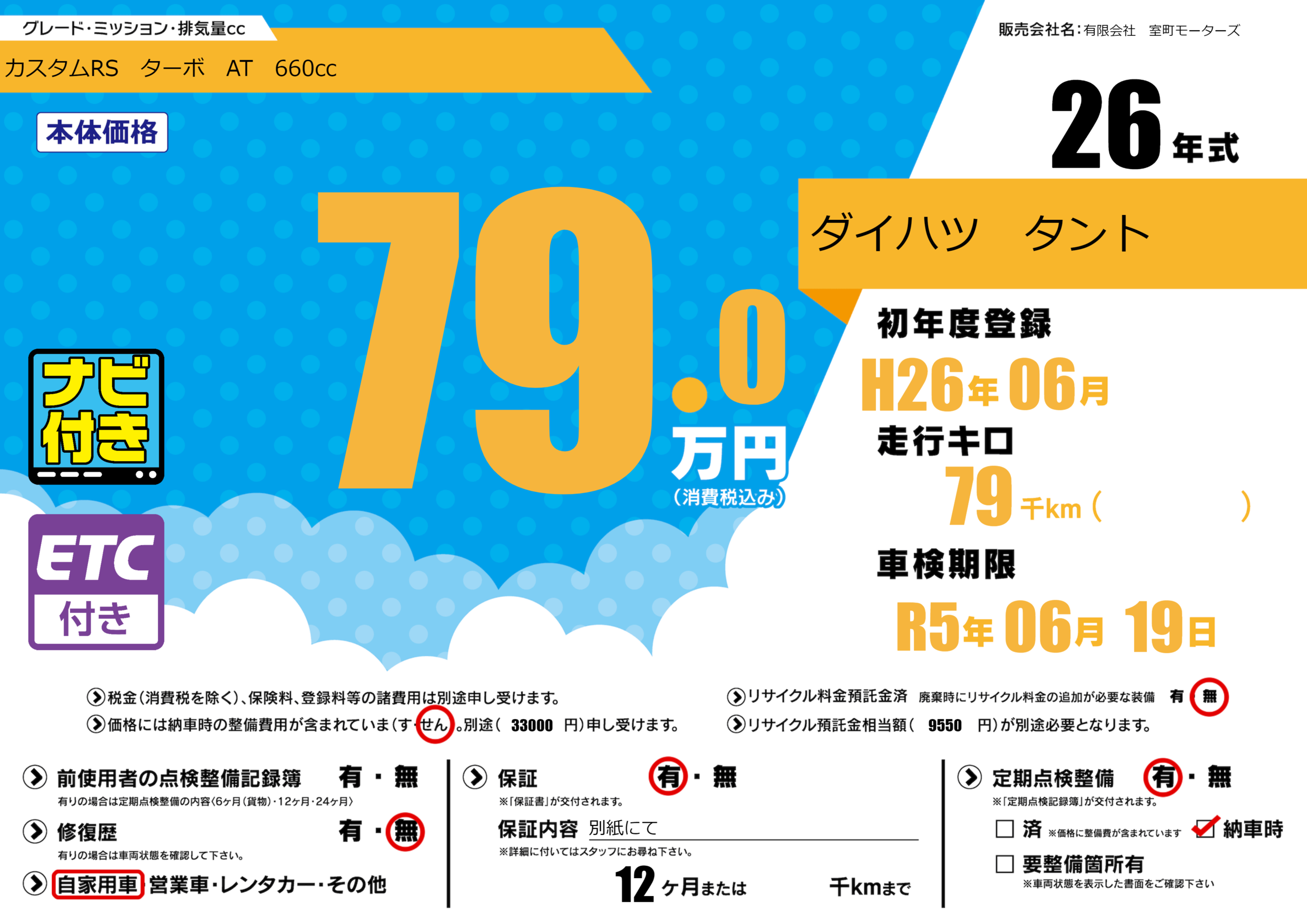 | 車名 | ダイハツ タント | グレード ミッション 排気量 |