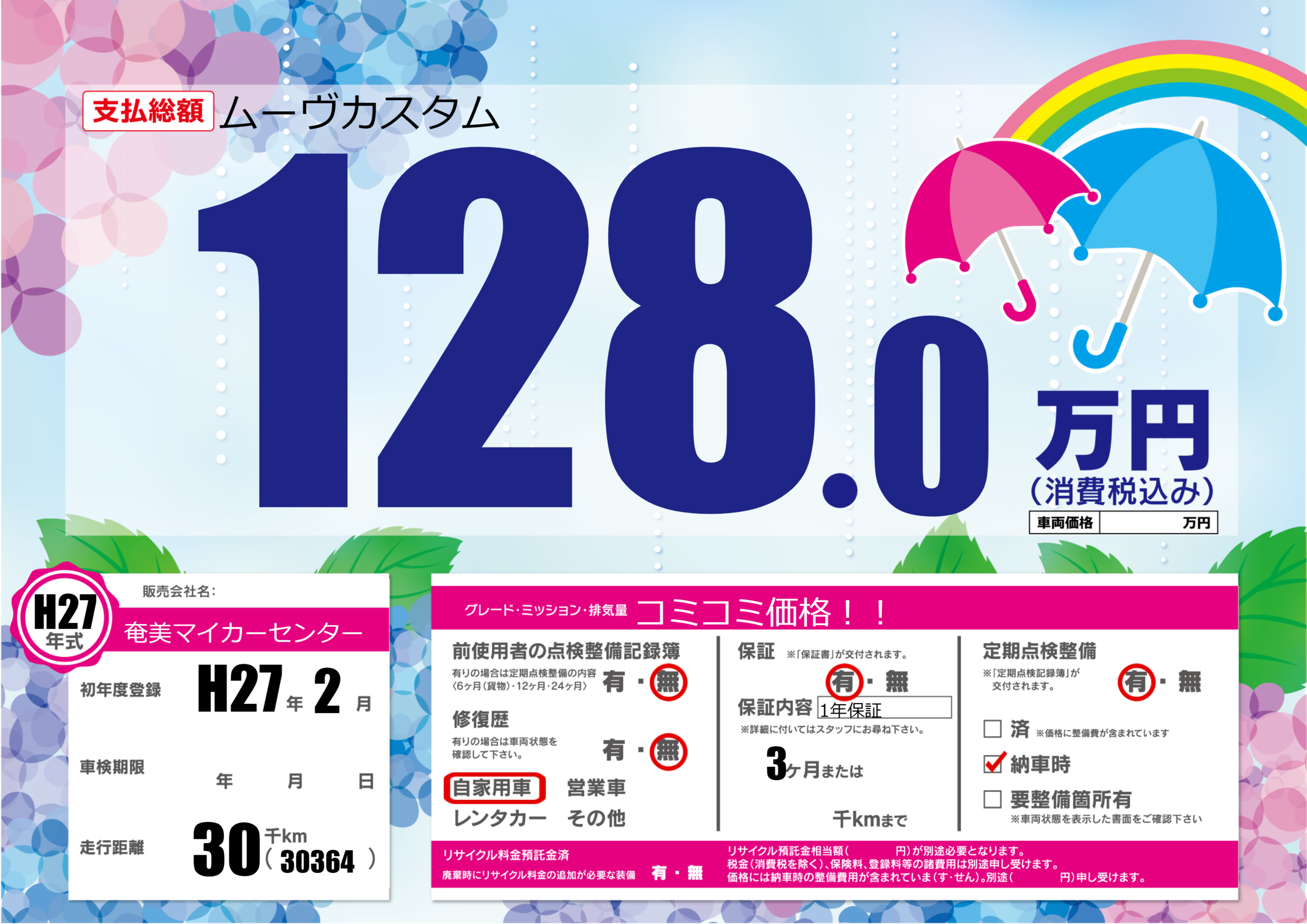 | 走行キロ | 3万km | 初年度登録 | H27年2月 |