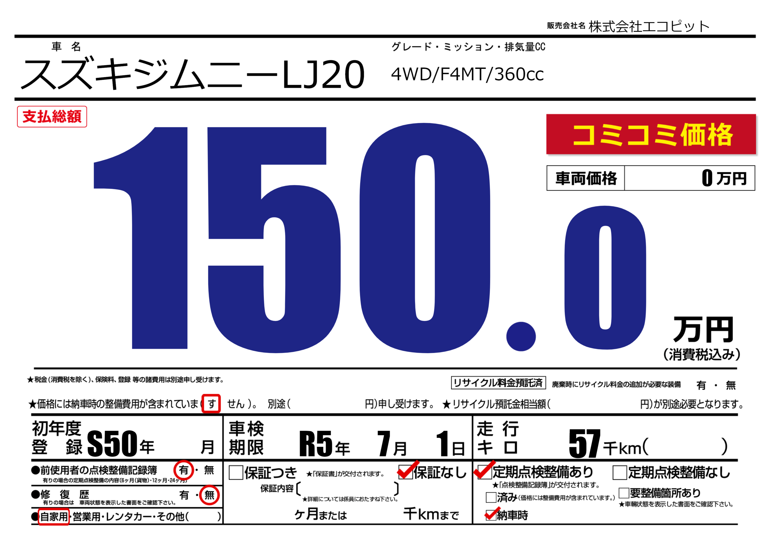 | 車名 | スズキジムニーLJ20 | グレード ミッション 排気量 |