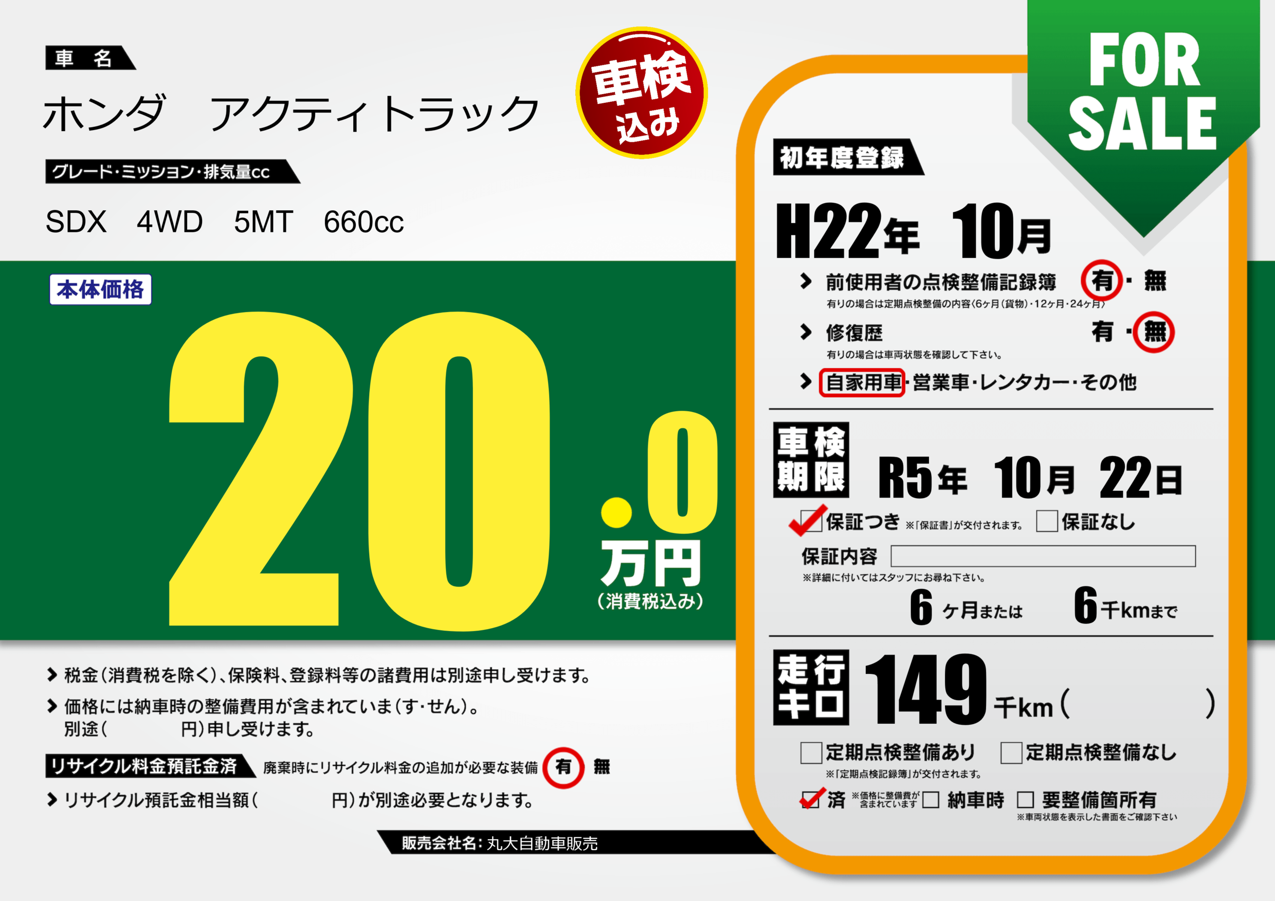 | 走行キロ | 14.9万km | 初年度登録 | H22年10月 |