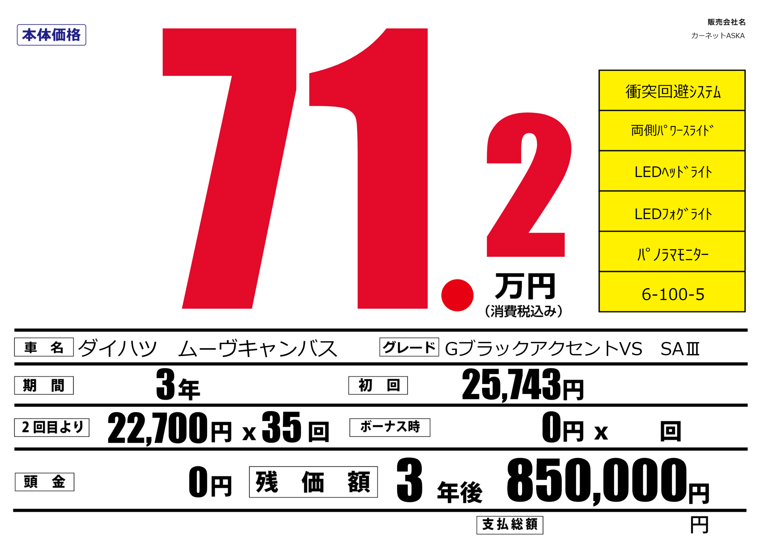 | 車名 | ダイハツ ムーヴキャンバス | グレード ミッション 排気量 |