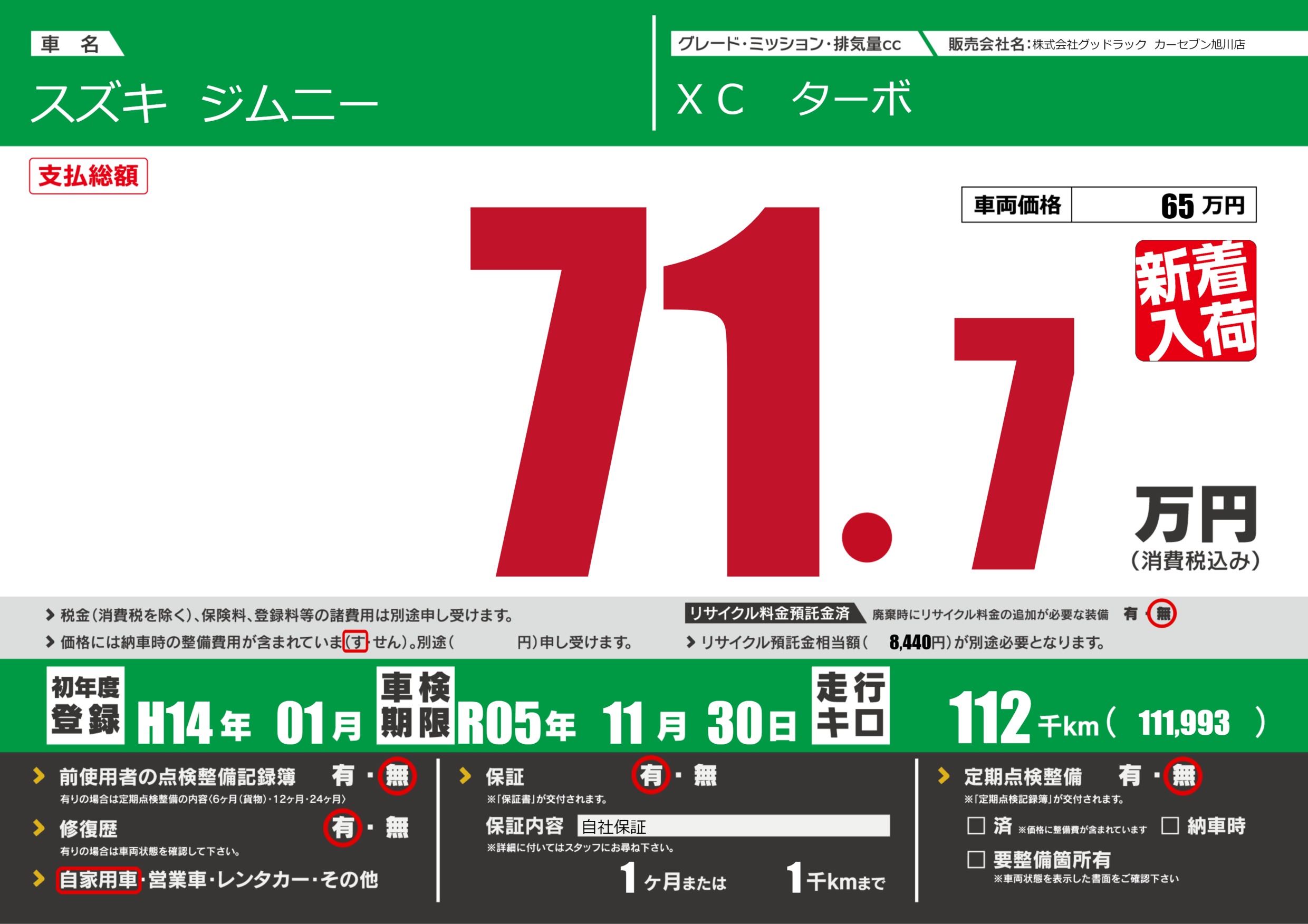 保証付き 保証内容(自社保証) 1ヶ月または(1)千kmまで |
