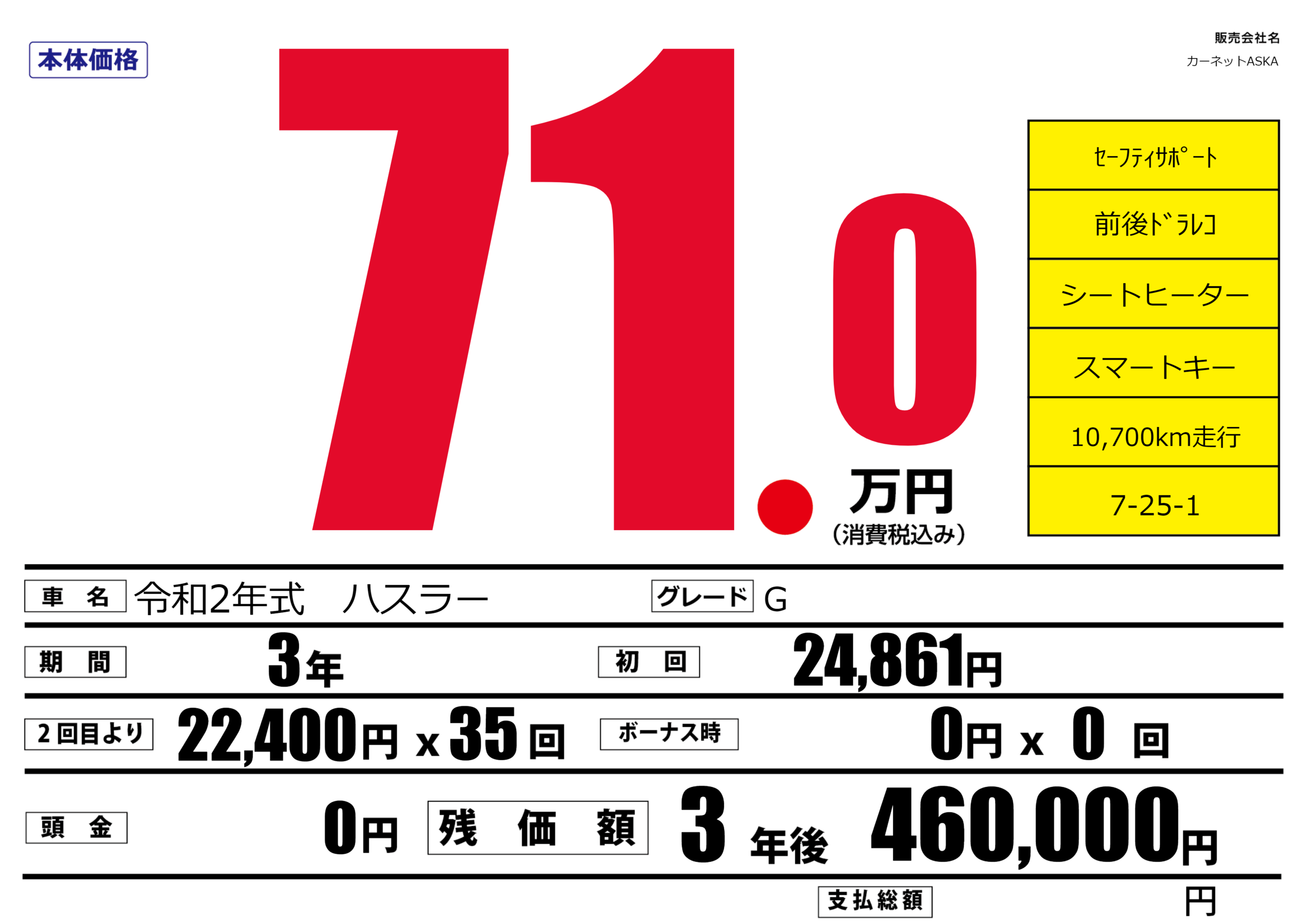 | 車名 | 令和2年式 ハスラー | グレード ミッション 排気量 |