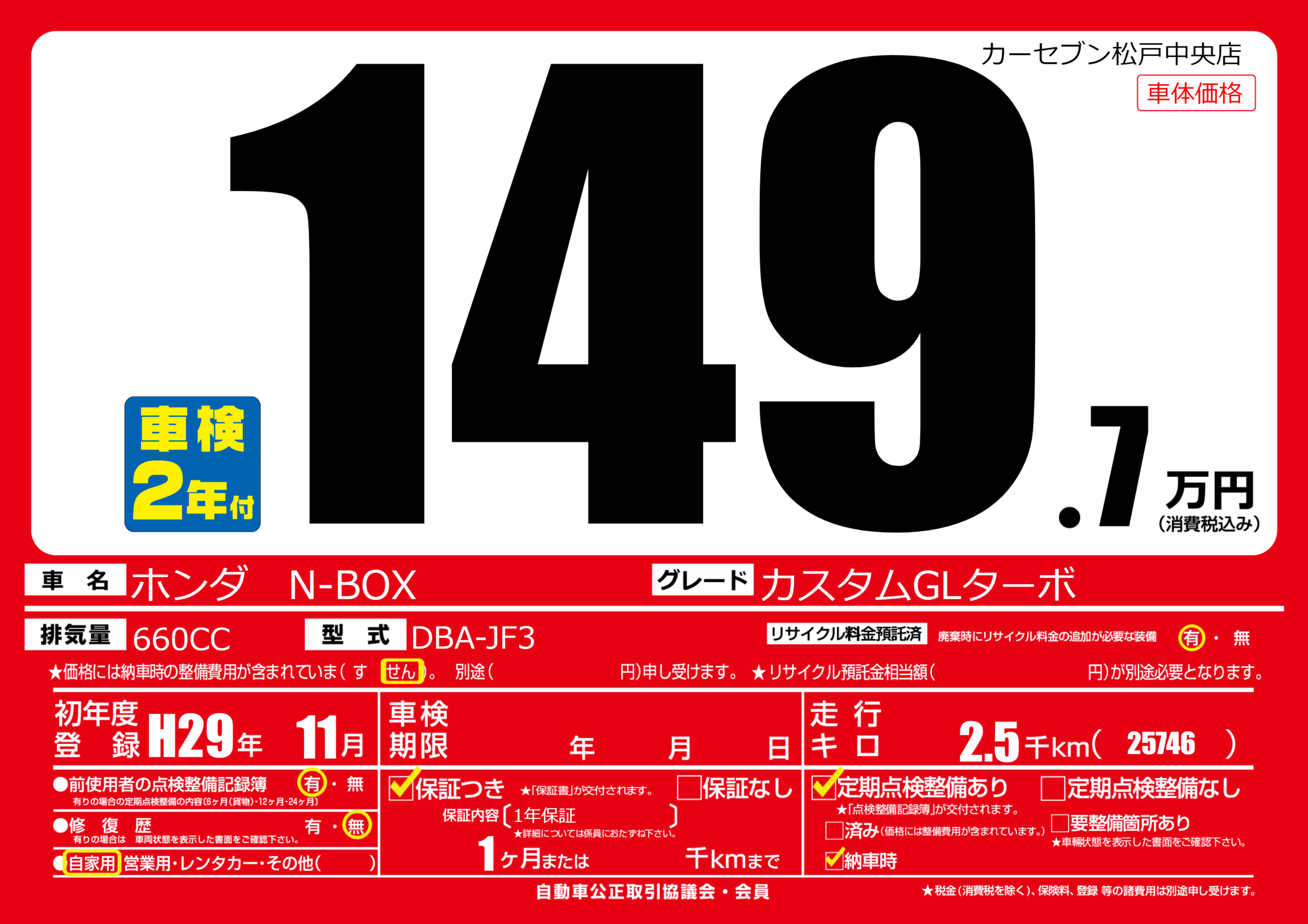 | 走行キロ | 0.2万km | 初年度登録 | H29年11月 |