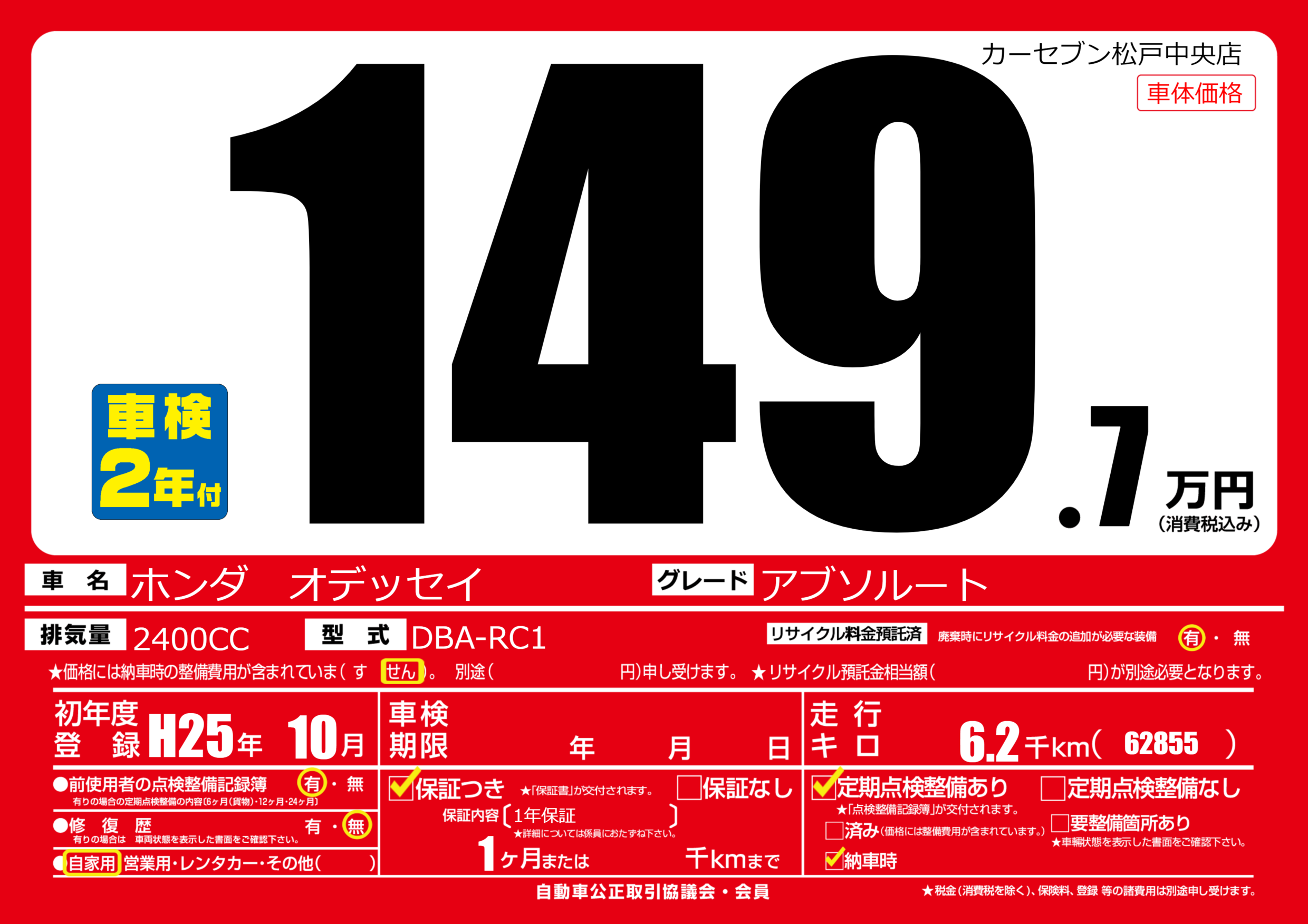 | 車名 | ホンダ オデッセイ | グレード ミッション 排気量 |