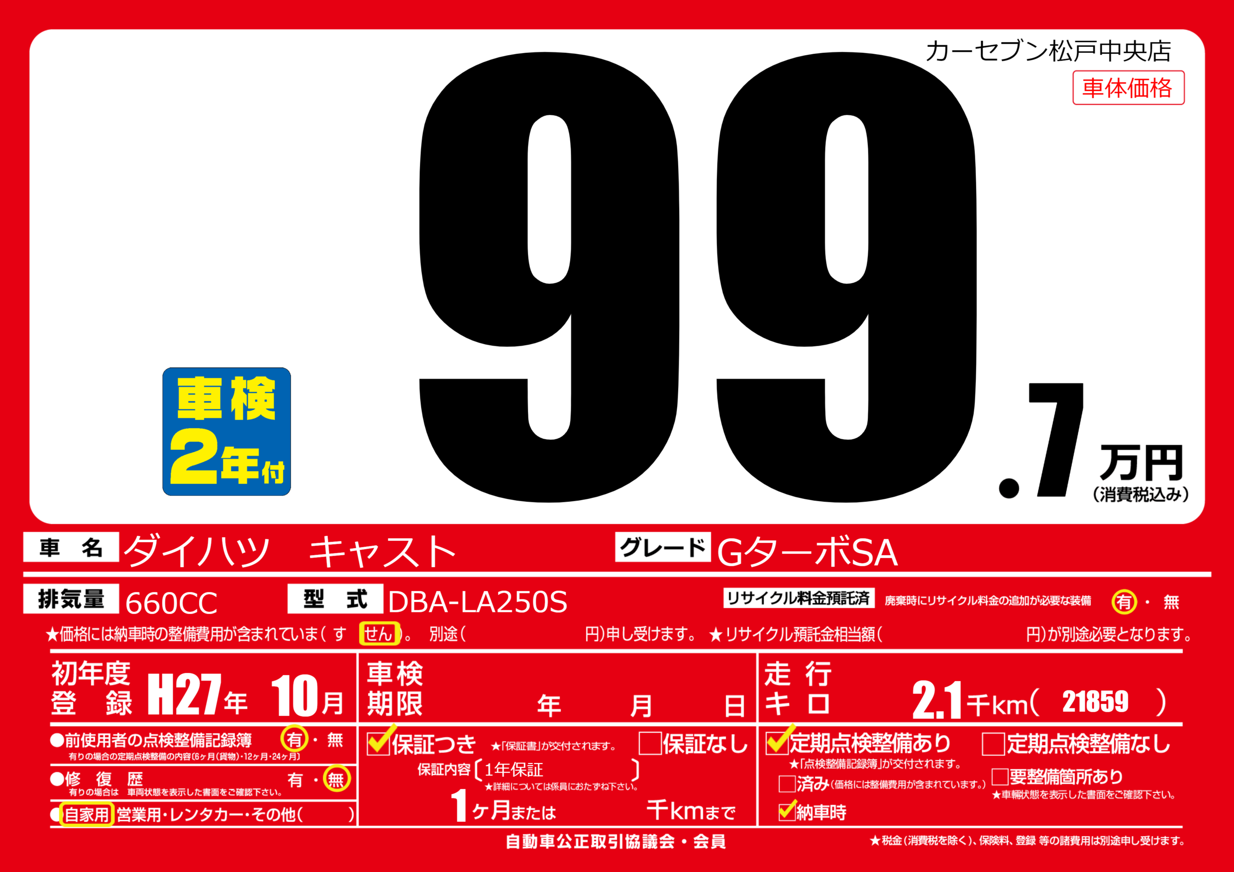 | 車名 | ダイハツ キャスト | グレード ミッション 排気量 |