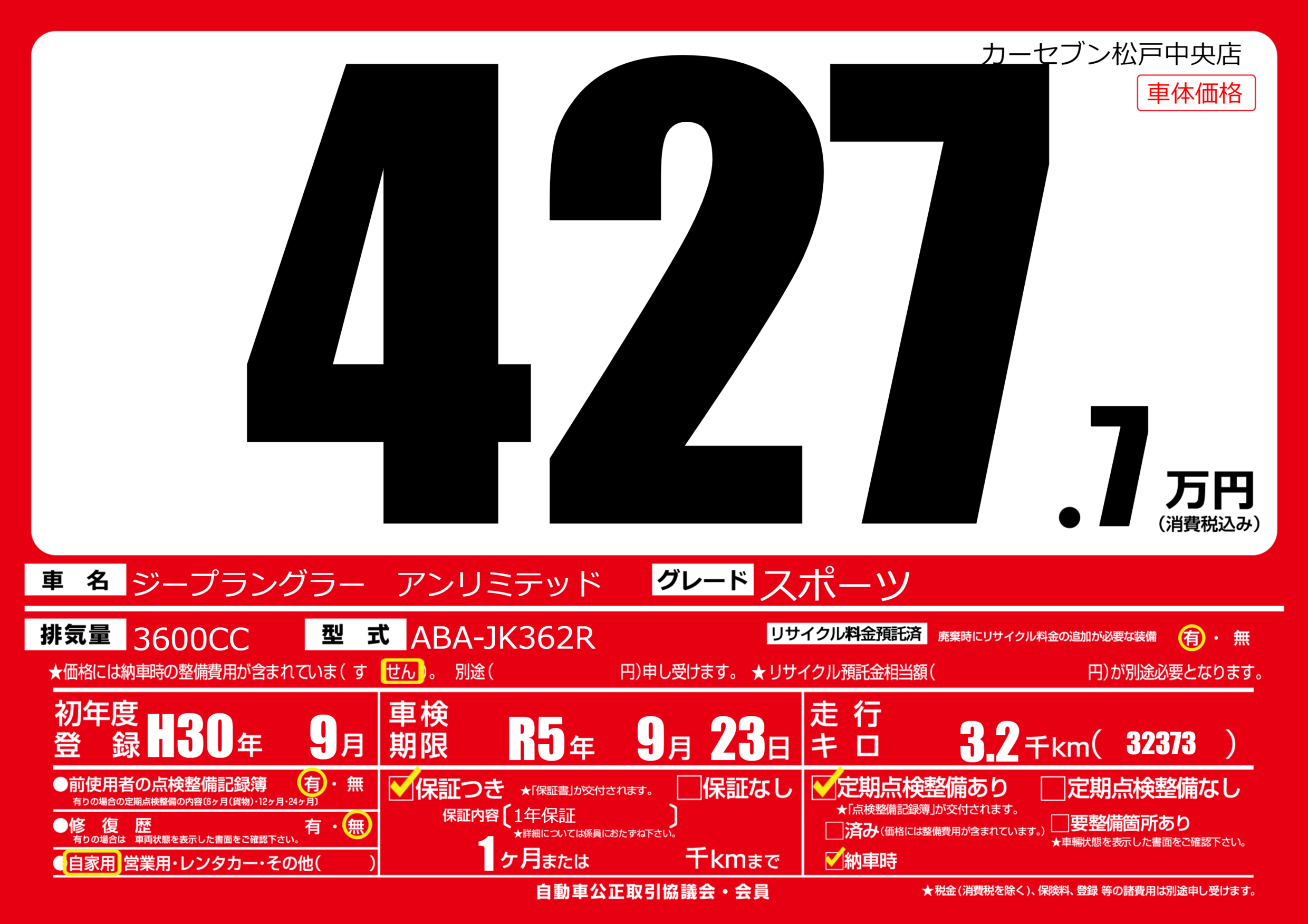 | 車名 | ジープラングラー アンリミテッド | グレード ミッション 排気量 |
