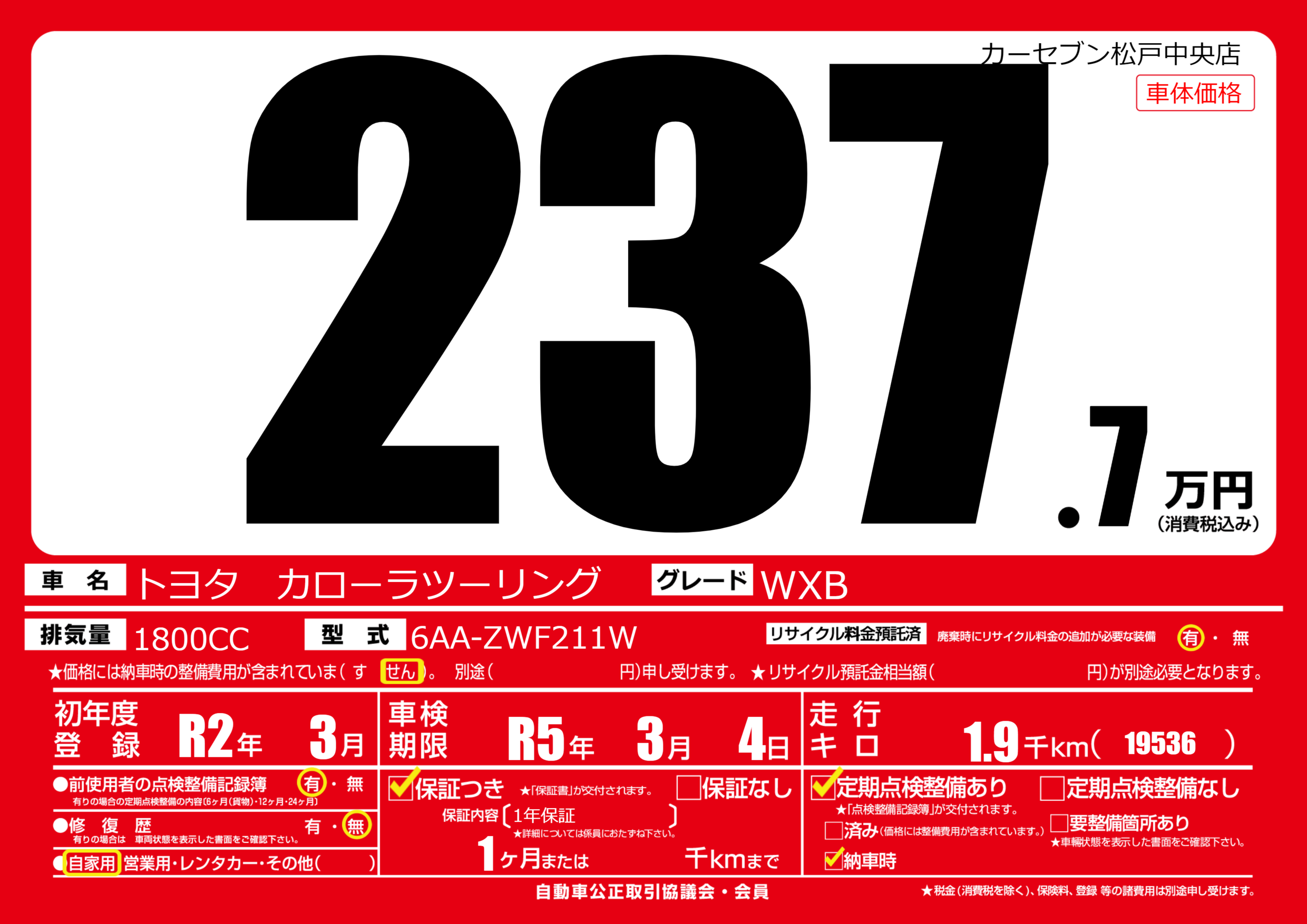 | 車名 | トヨタ カローラツーリング | グレード ミッション 排気量 |