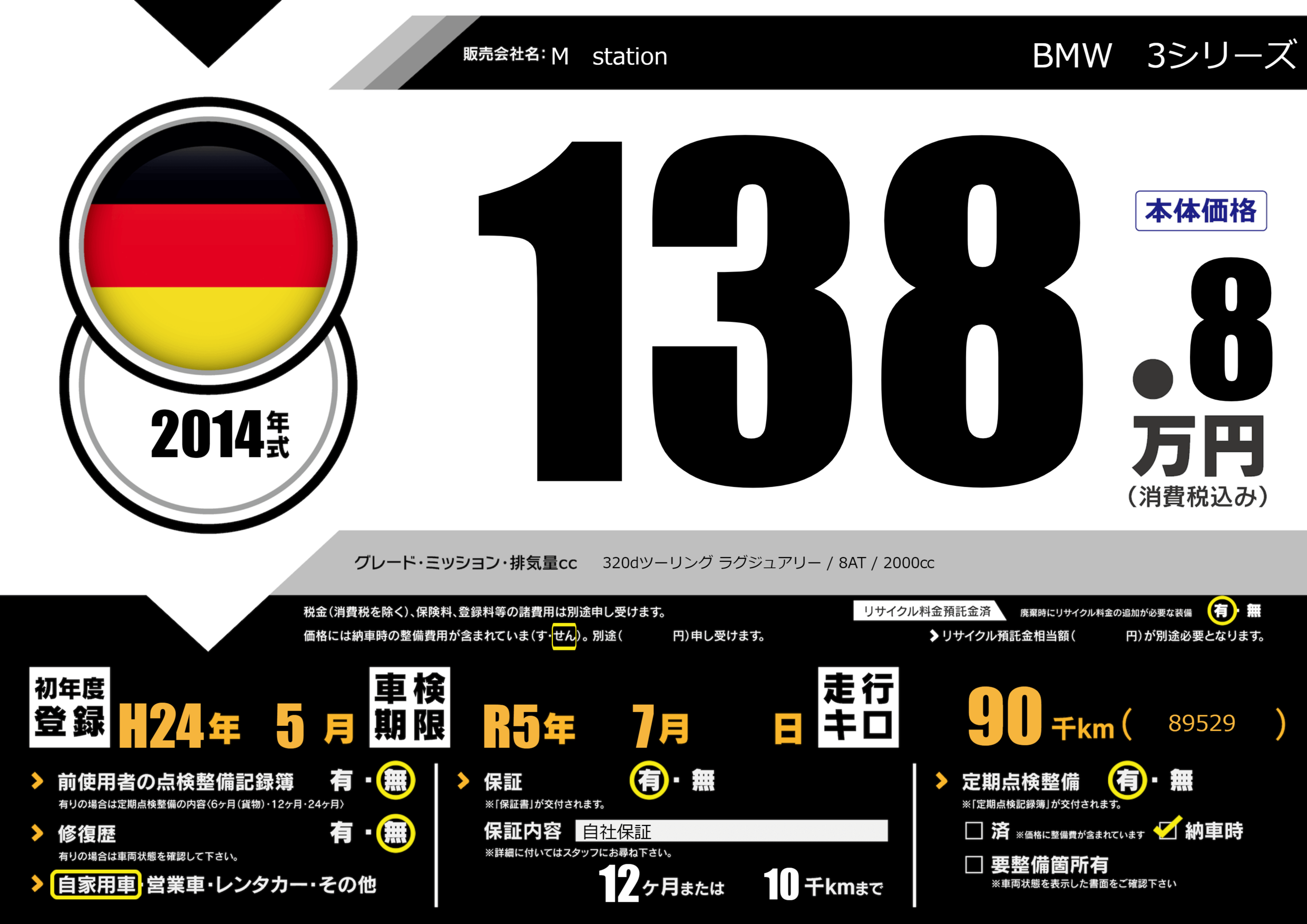 | 走行キロ | 9万km | 初年度登録 | H24年5月 |