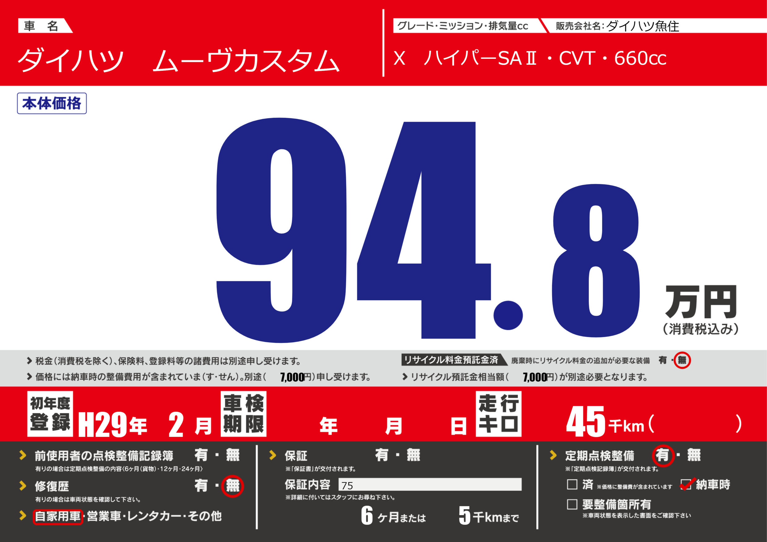| 定期点検整備 | 定期点検整備あり 納車時あり | ||