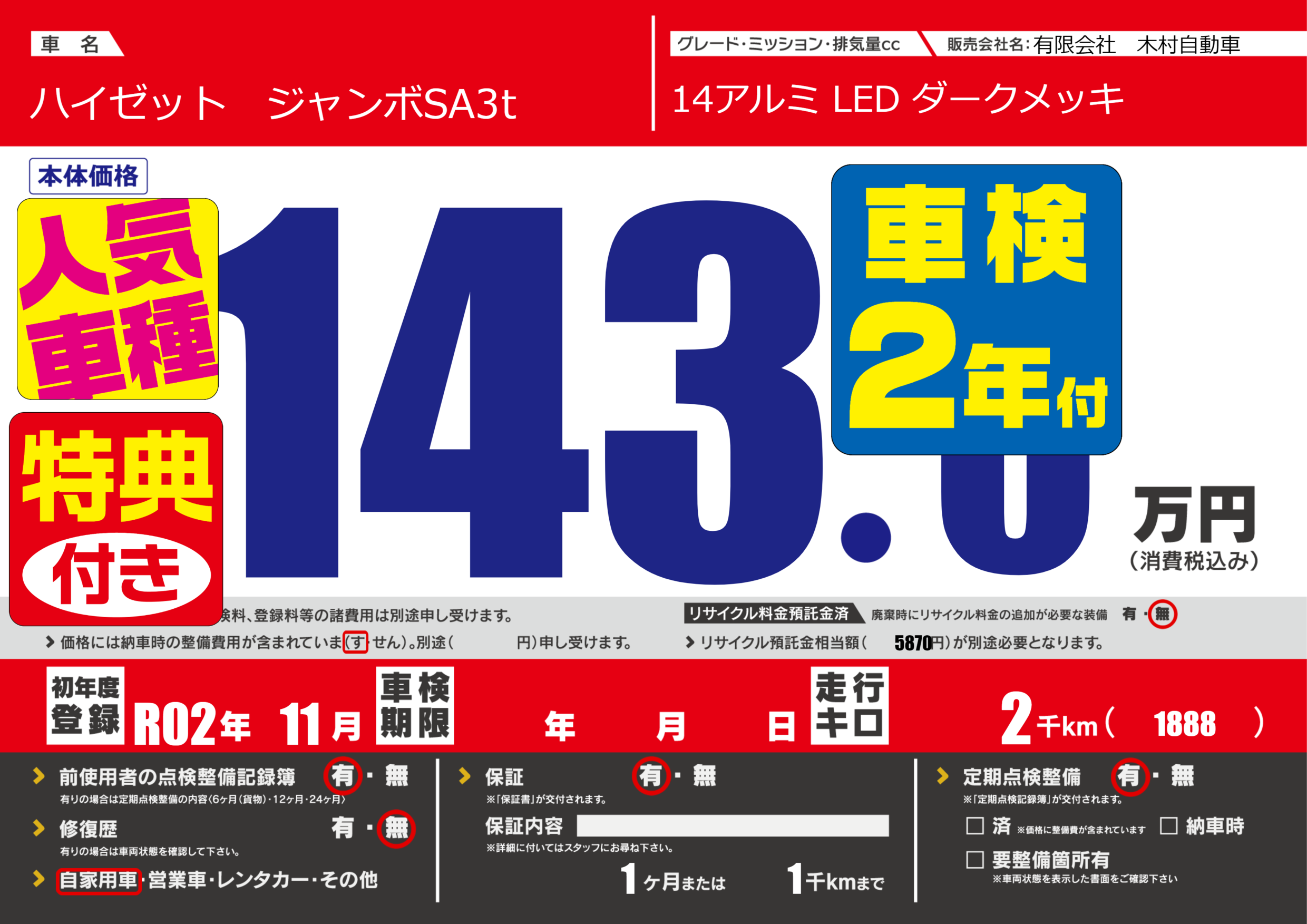 | 車名 | ハイゼット ジャンボSA3t | グレード ミッション 排気量 |
