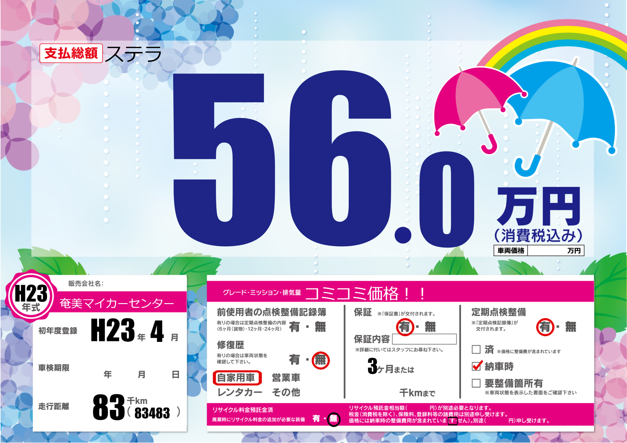 | 走行キロ | 8.3万km | 初年度登録 | H23年4月 |