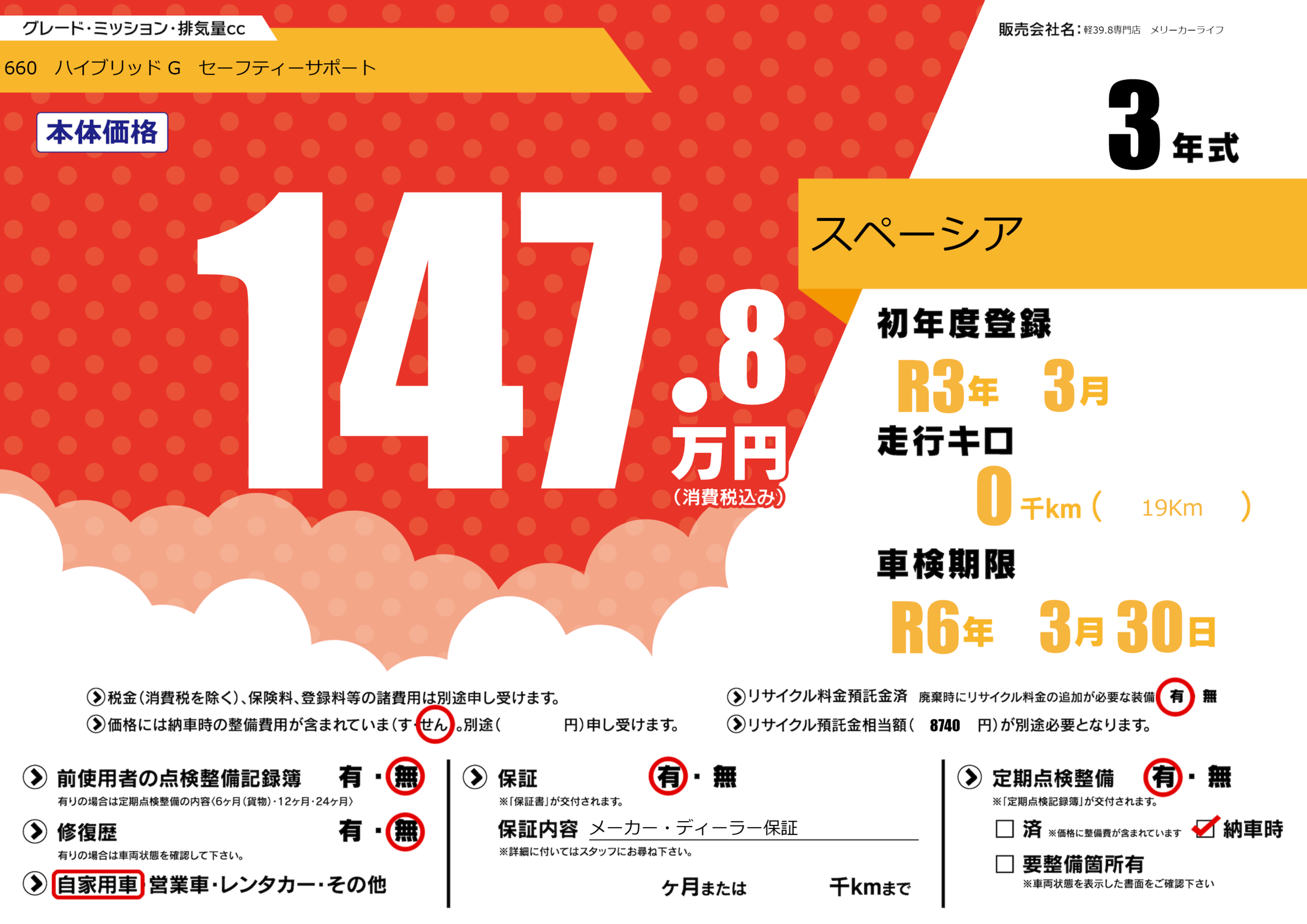 | 定期点検整備 | 定期点検整備あり 納車時あり | ||
