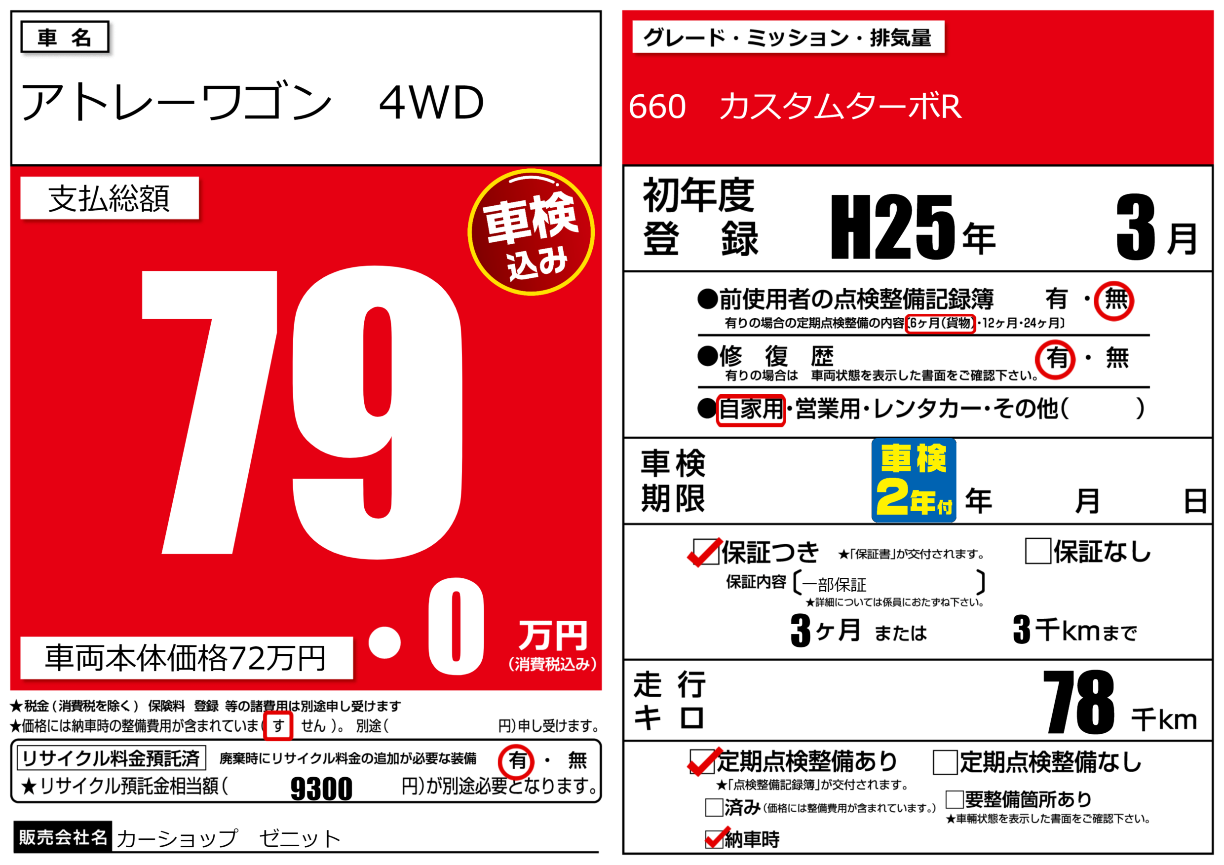| 定期点検整備 | 定期点検整備あり 納車時あり | ||