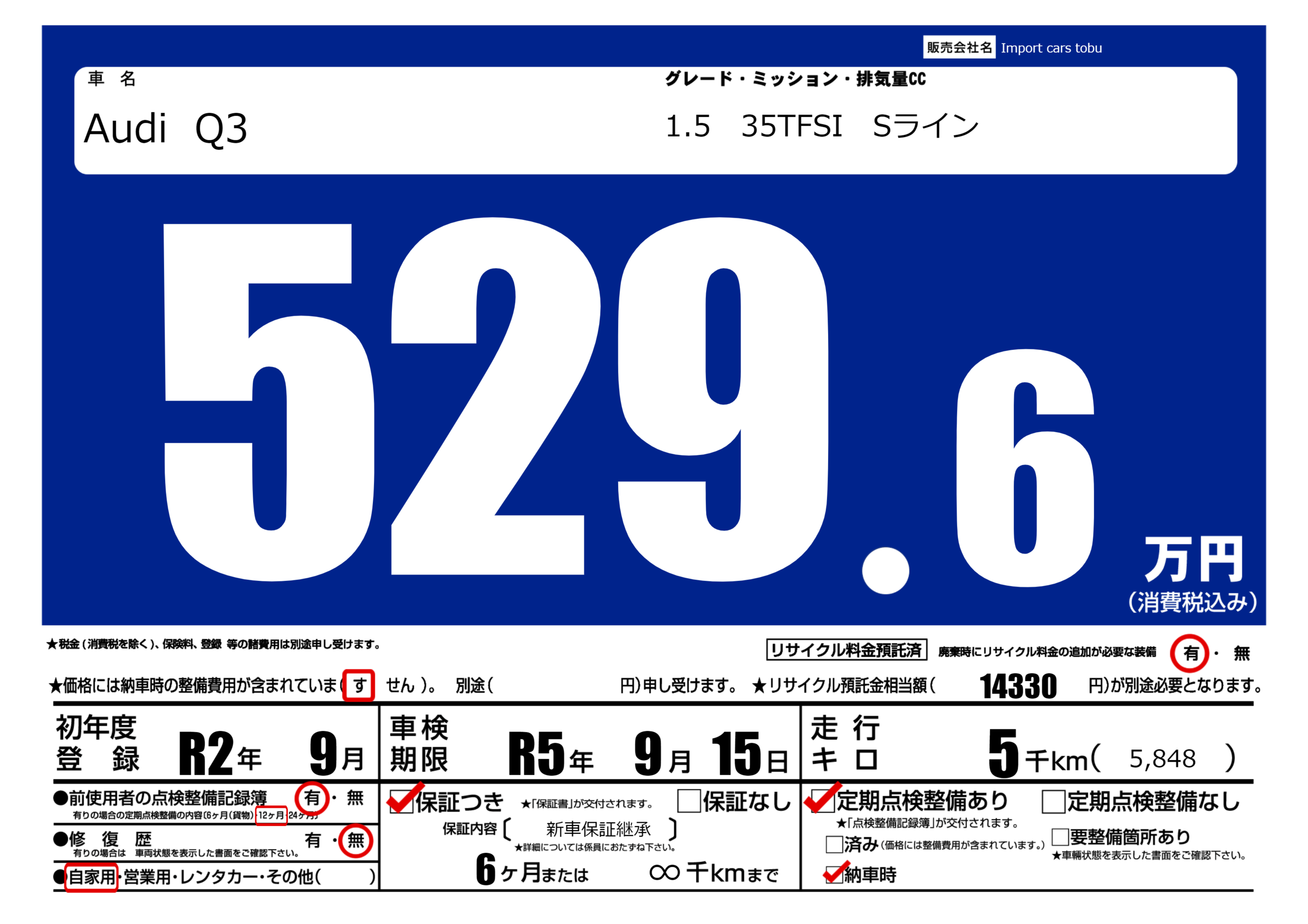 保証付き 保証内容( 新車保証継承) 6ヶ月または(∞)千kmまで |