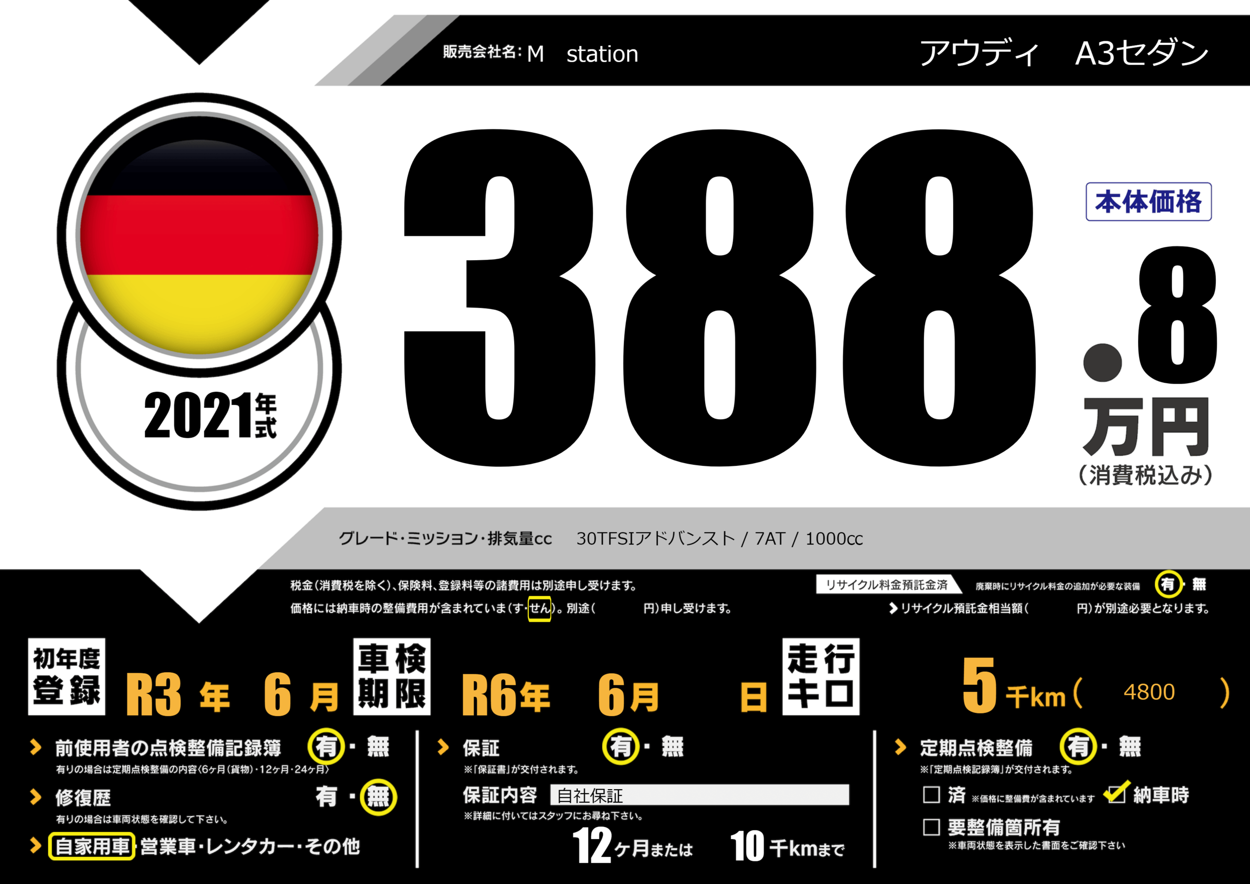 | 走行キロ | 0.5万km | 初年度登録 | R3年6月 |