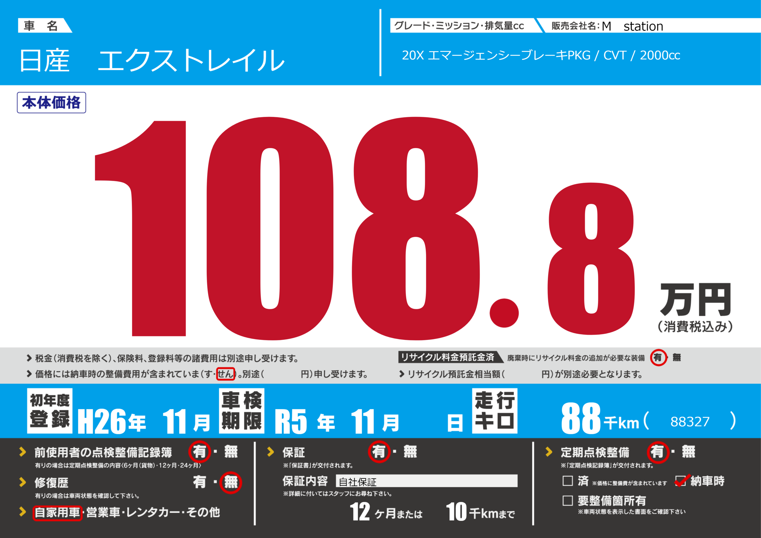 | 車名 | 日産 エクストレイル | グレード ミッション 排気量 |