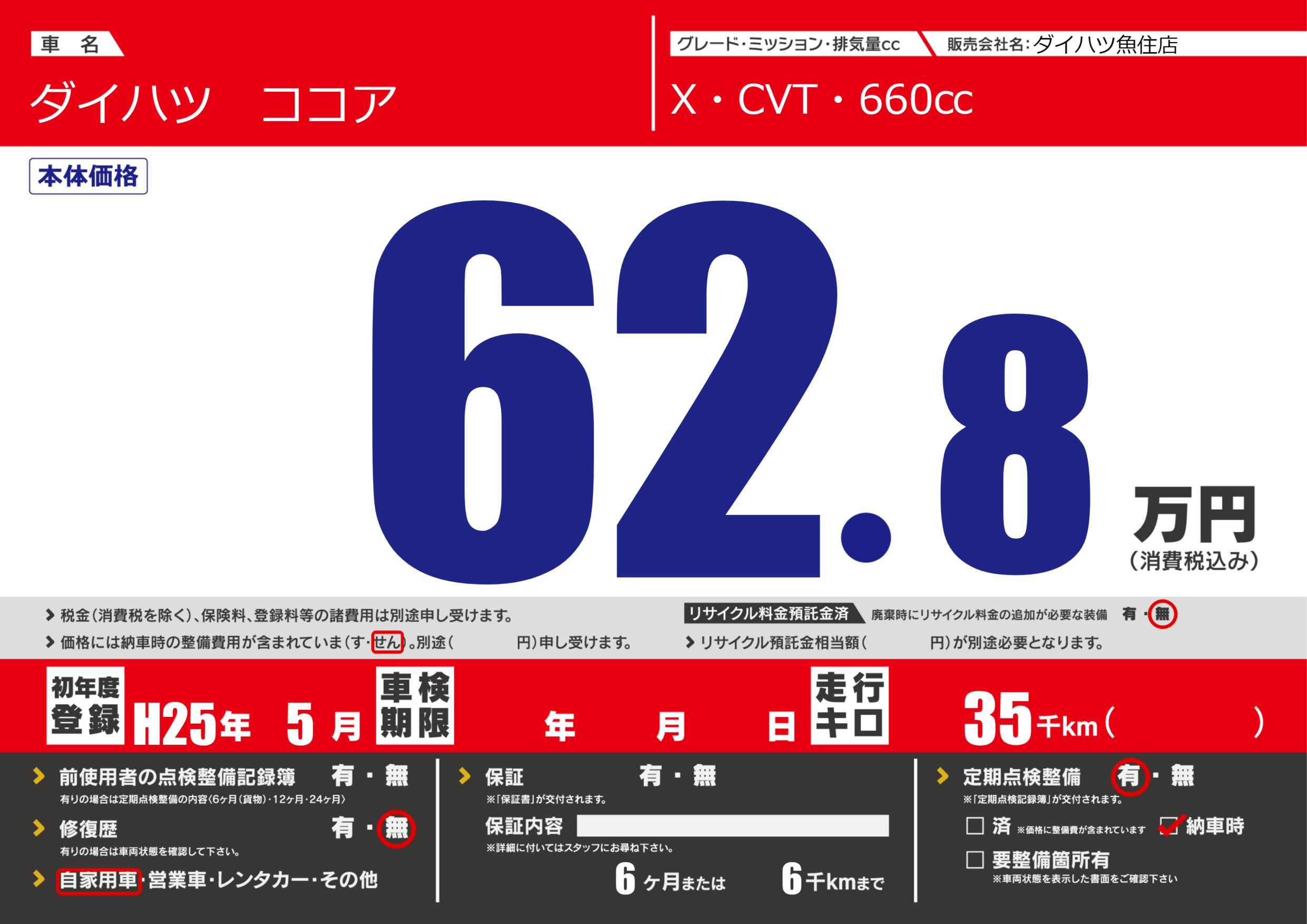 | 車名 | ダイハツ ココア | グレード ミッション 排気量 |