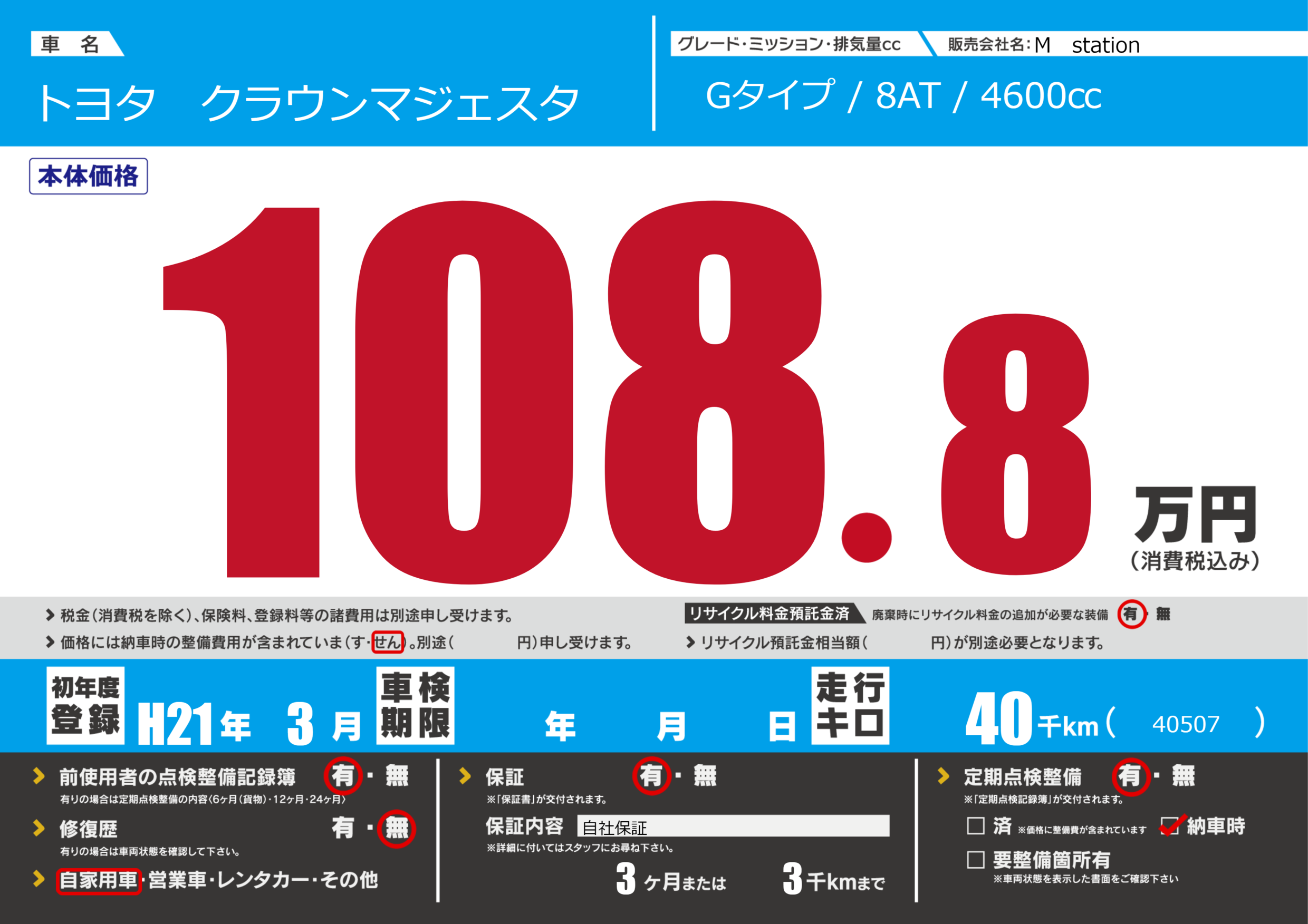 | 車名 | トヨタ クラウンマジェスタ | グレード ミッション 排気量 |