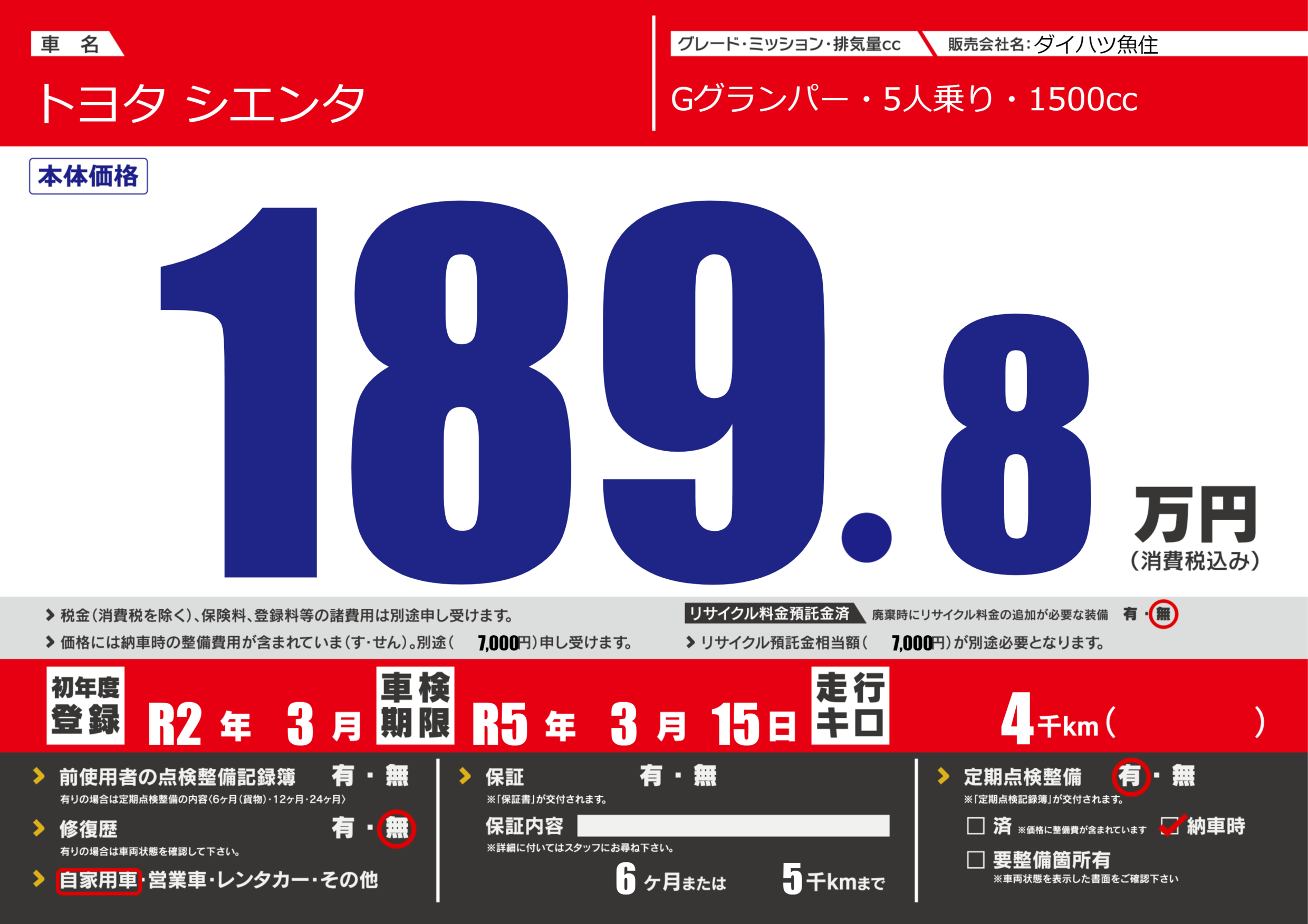| 車名 | トヨタ シエンタ | グレード ミッション 排気量 |