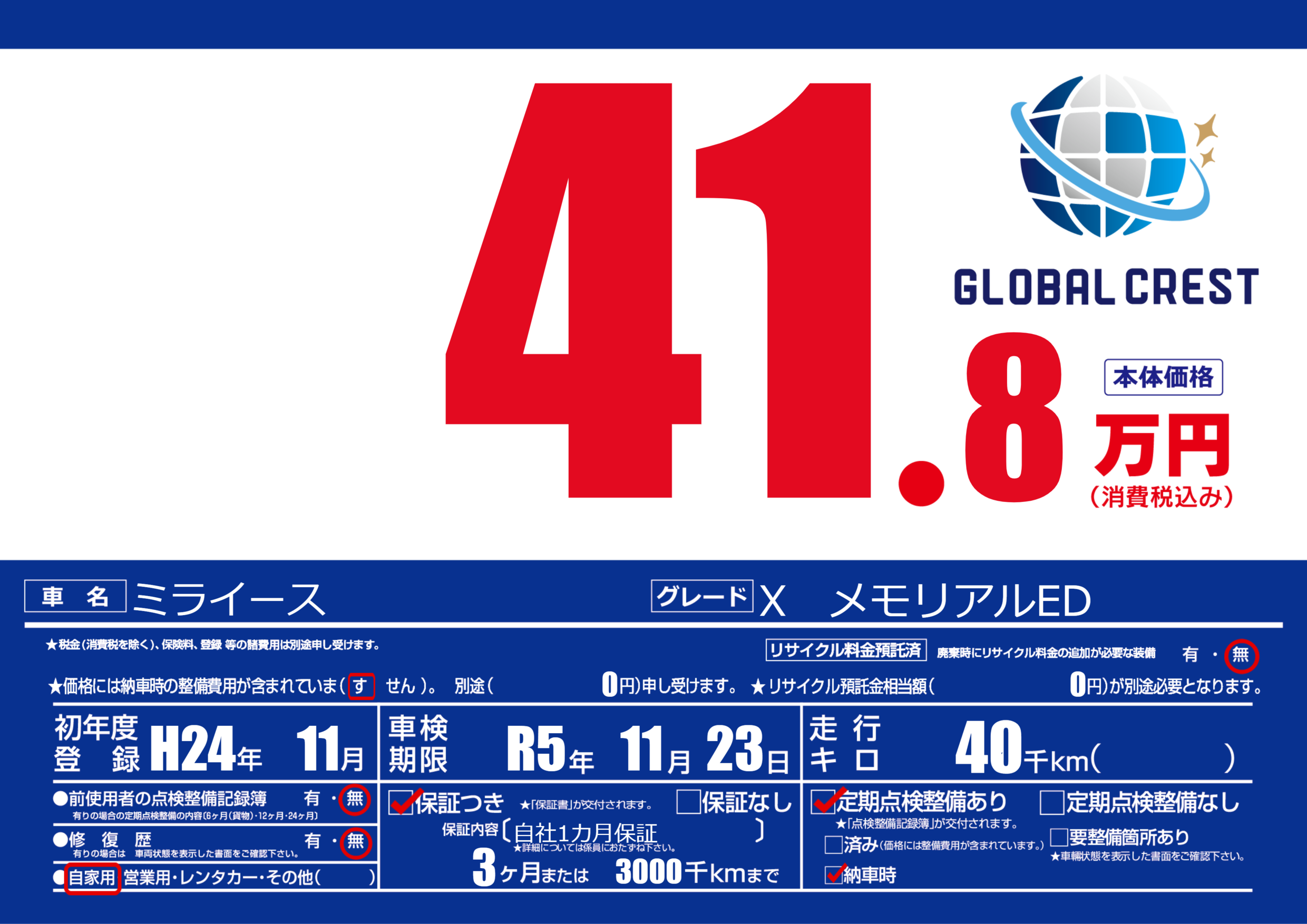 | 走行キロ | 4万km | 初年度登録 | H24年11月 |