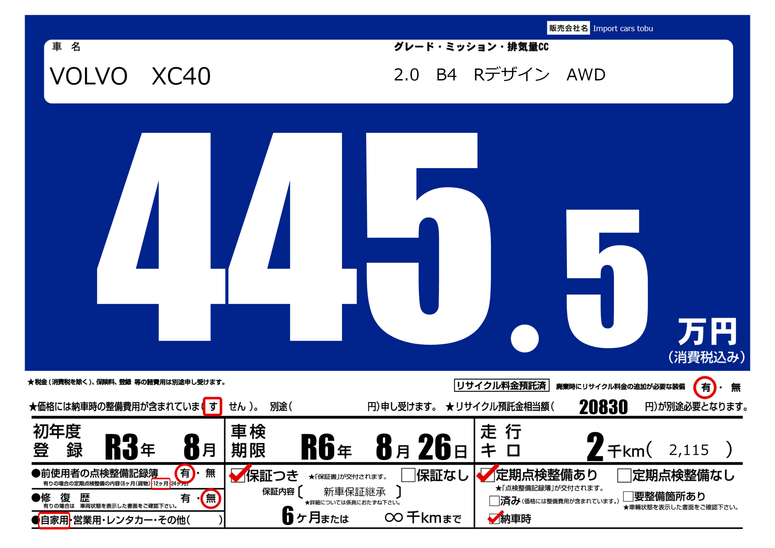 保証付き 保証内容( 新車保証継承) 6ヶ月または(∞)千kmまで |