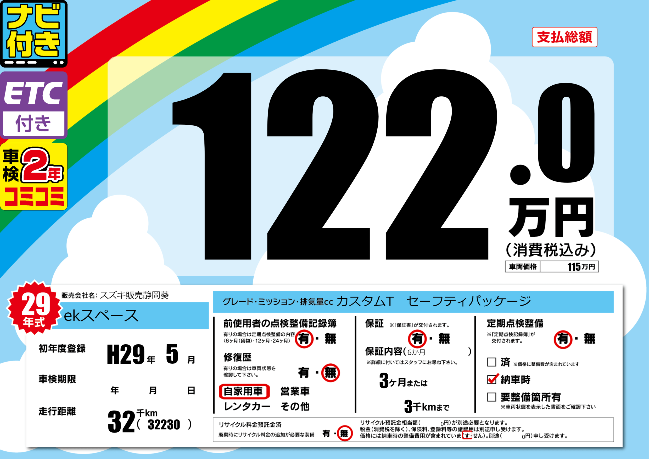 | 定期点検整備 | 定期点検整備あり 納車時あり | ||