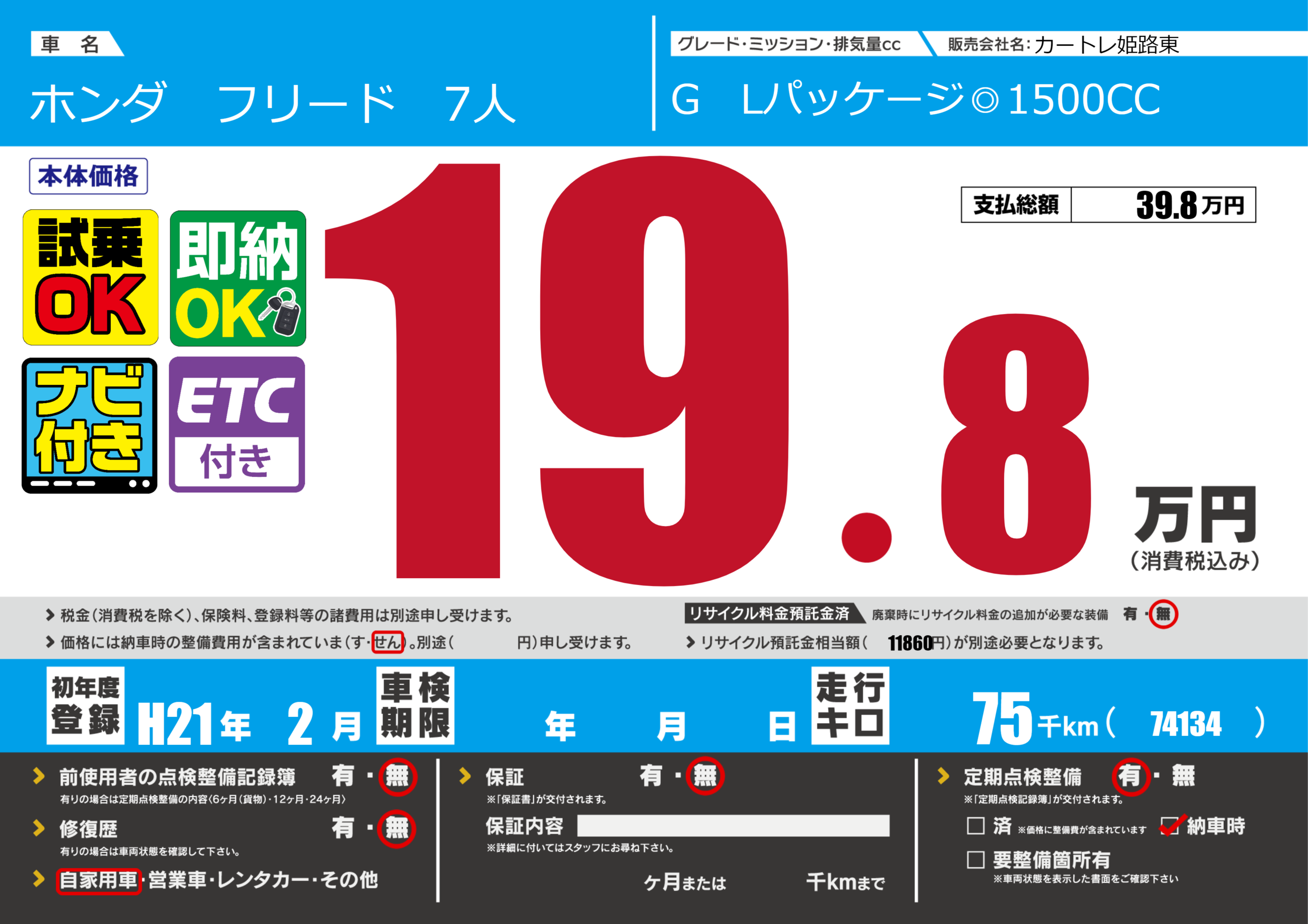 | 車名 | ホンダ フリード 7人 | グレード ミッション 排気量 |