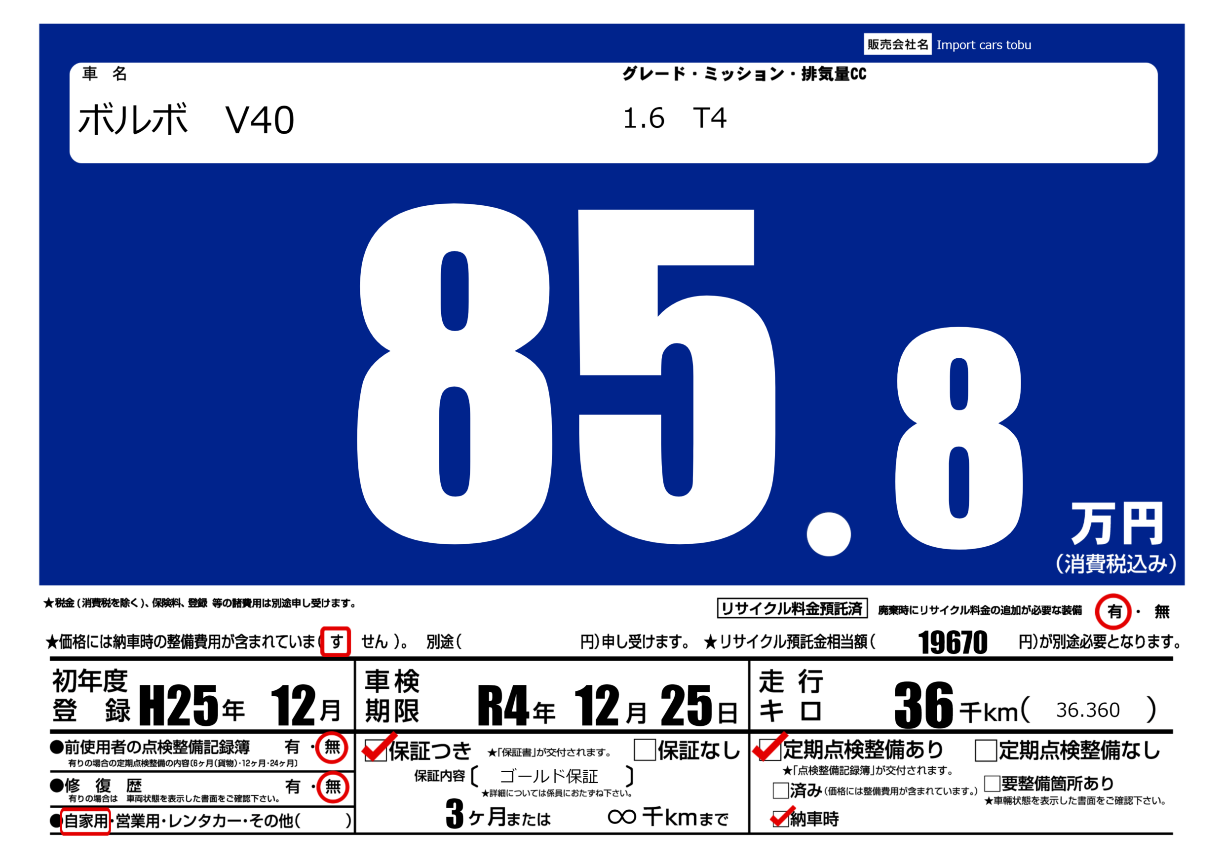 | 車名 | ボルボ V40 | グレード ミッション 排気量 |